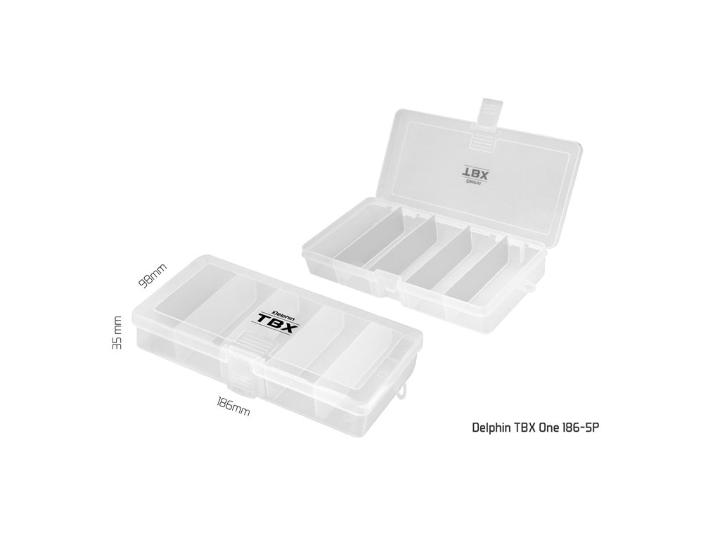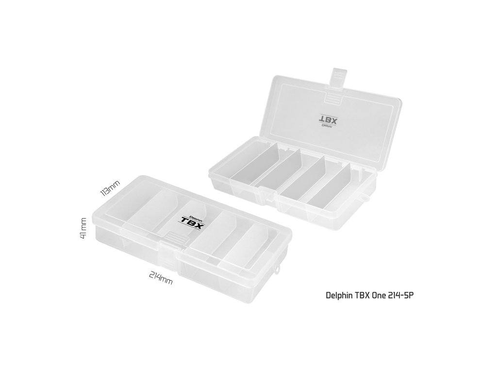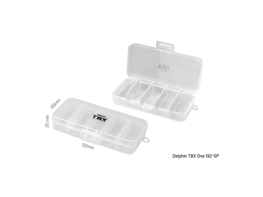 TBX ONE je řada multifunkčních krabiček určených pro uložení rybářského příslušenství. Vyrobené jsou z transparentního plastu, takže máte vždy dokonalý přehled o uložených věcech uvnitř krabičky. Řada TXB ONE je vybavena praktickými klipy z transparentního plastu. Technické parametre: Model: Delphin TBX One 132-5P Rozměr: 132x65x25mm Počet pevných přihrádek: 5 Rozměr přihrádky: 2,5x5,7x2,1cm Počet vkladatelných příčníků: 0 Model: Delphin TBX One 186-5P Rozměr: 186x98x35mm Počet pevných přihrádek: 5 Rozměr přihrádky: 3,5x9,3x3,5cm Počet vkladatelných příčníků: 0 Model: Delphin TBX One 214-5P Rozměr: 214x113x41mm Počet pevných přihrádek: 5 Rozměr přihrádky: 4x10,9x3,5cm Počet vkladatelných příčníků: 0Doplňkové parametry