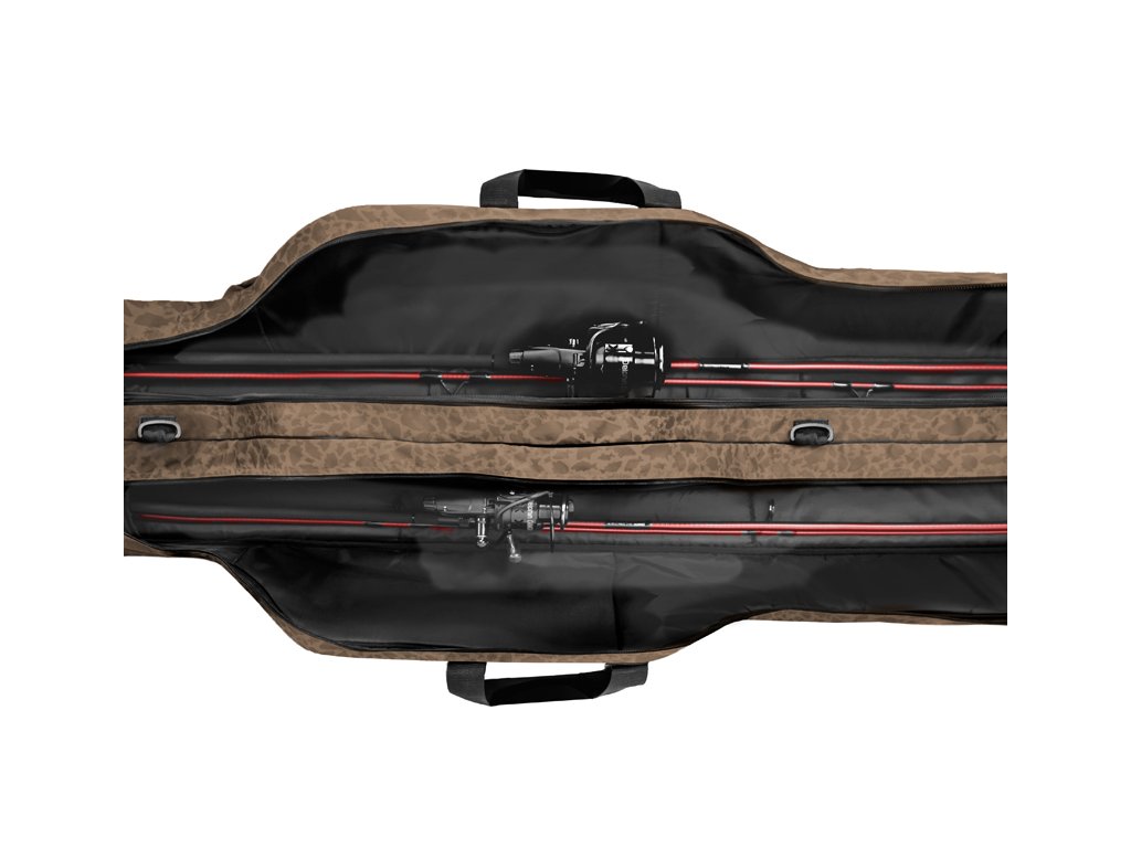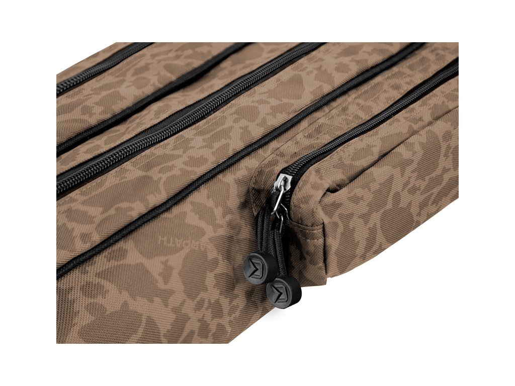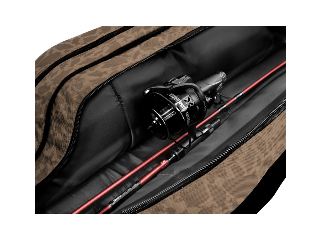 Prémiové a do detailů propracované kaprařské pouzdro, doplňující sérii produktů z řady AREA s jedinečnou kamufláží CARPATH. Stěny pouzdra jsou důkladně polstrované 6mm hrubou výstelkou a vnitřní prostor poskytuje dostatek místa pro pohodlné uložení jakýchkoliv kaprařských prutů s navijáky. Dokonce i pruty s 50mm naváděcím očkem se do pouzdra vejdou snadno a s dostatečnou rezervou. Každá komora má zvláštní zipovatelný vstup, což zajišťuje, že pruty jsou po celou dobu od sebe odděleny a dokonale zafixované pomocí praktických uložení ve spodní části a také páskami se suchým zipem. Díky zmíněným vlastnostem je zaručeno, že během transportu a při manipulaci s pouzdrem je výbava uvnitř maximálně chráněna. Pouzdro je vyrobeno z velmi kvalitní textilie, která si bez problémů poradí i s menším úhrnem srážek. Po celé spodní straně je našitý odolný nepromokavý materiál, díky čemuž se ho nemusíte obávat položit na mokrou zem, či do trávy s ranní rosou. V případě znečištění, je velmi jednoduché tento materiál omýt. Charakteristickým znakem pro Delphin AREA DoubleSAFE je také jeho "reverzní" provedení, což znamená, že prut se dovnitř vkládá s navijákem orientovaným směrem nahoru. Hlavní výhoda takového provedení spočívá v tom, že nedochází při položení pouzdra ke kontaktu navijáků se zemí. Tím pádem jsou lépe chráněny a je minimalizována šance jejich poškození. Na boční straně je umístěna dlouhá kapsa se zipem, která bez problémů pojme například podběrák. Na této kapse je navíc našitá vnější kapsa a utahovací popruh s klipem. To umožňuje transport dalšího prutu, ale také zde můžete upevnit jiné příslušenství jako například kobru nebo vidličky. Pohodlný transport pouzdra zaručuje délkově nastavitelný popruh na rameno s vyztuženou částí a dvě rukojeti. Tak jak už to bývá při produktech z řady AREA standardem, i při tomto modelu byly použity kvalitní zipy s běžci, bezchybné šití či ergonomické střihy. CARPATH kamufláž navíc vykouzlí úsměv všem jejím příznivcům, kterým dosud ve své výbavě právě takové pouzdro chybělo. Technické parametry: Model: Delphin AREA DoubleSAFE 360-3 Vnější délka pouzdra: 135cm Délka bočního sáčku 110cm Pro pruty: 360cm / 3 díly Model: Delphin AREA DoubleSAFE 300-2 Vnější délka pouzdra: 165cm Délka bočního sáčku 110cm Pro pruty: 300cm / 2 díly, 360cm / 2 díly TeleFIX Model: Delphin AREA DoubleSAFE 360-2 Vnější délka pouzdra: 195cm Délka bočního sáčku 110cm Pro pruty: 360cm / 2 dílyDoplňkové parametry