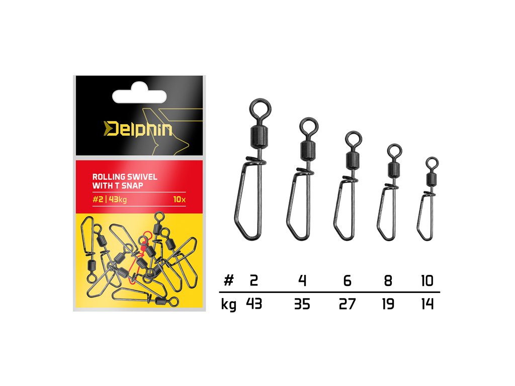 Karabinka s obratlíkem Delphin Rolling swivel with T snap je komponent koncové montáže pro rychlou výměnu přívlačových nástrah nebo zátěží, přičemž jeho použití eliminuje kroucení vlasce při navíjení. Díky pěti nabízeným velikostem lze přizpůsobit velikost karabiny velikosti použité nástrahy.Doplňkové parametry