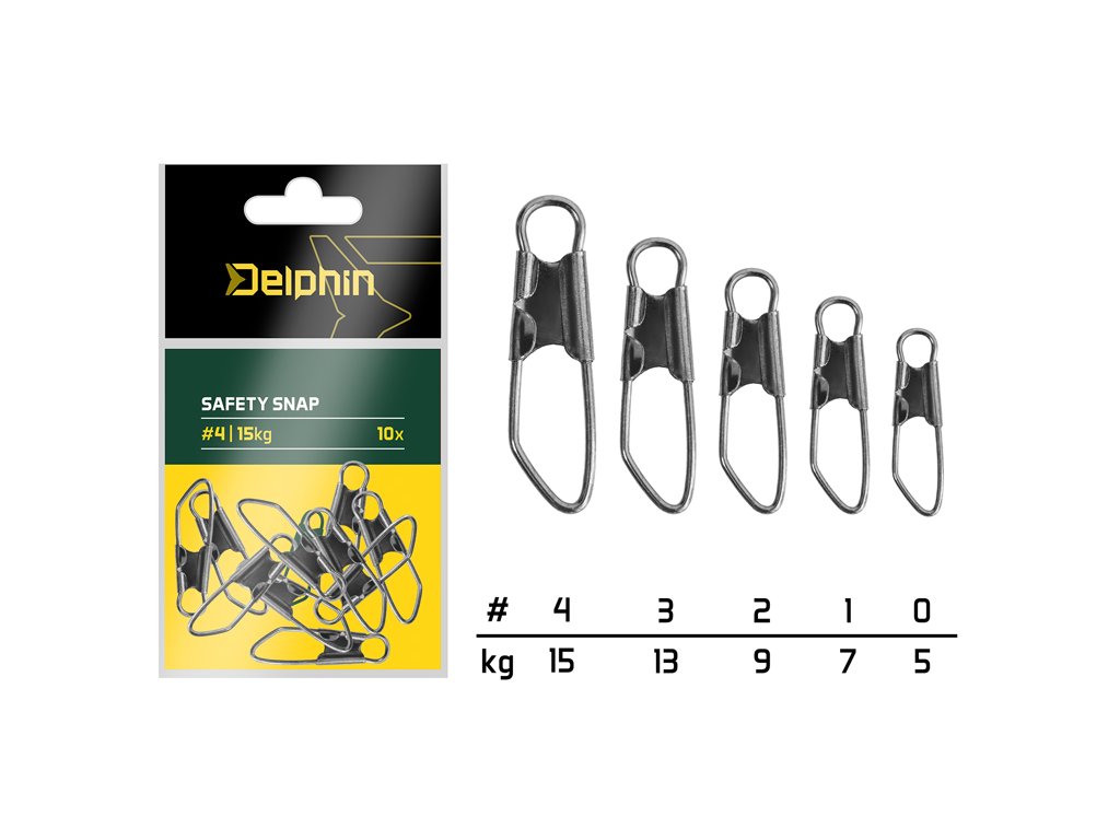 Delphin Safety snap je bezpečnostní karabinka sloužící pro rychlou a snadnou výměnu přívlačových nástrah nebo zátěží. K dispozici je pět velikostí, které pokrývají širokou škálu použití.Doplňkové parametry