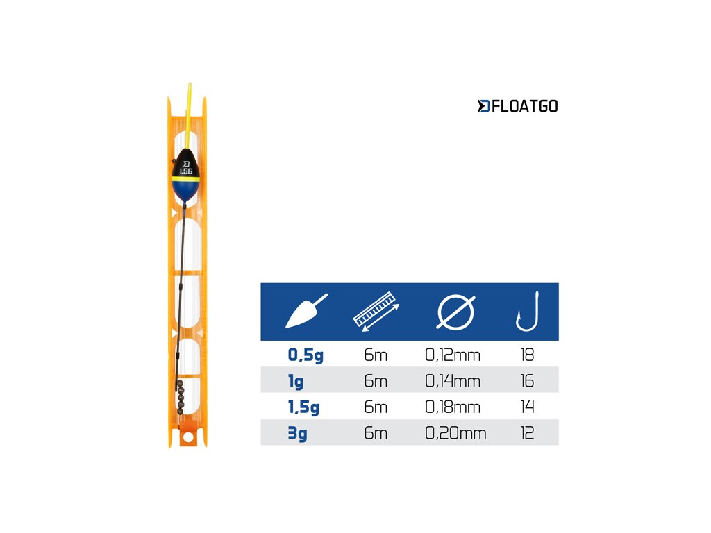 Kompletní systém o délce 6m určený pro lov na bič, zahrnující splávek ve tvaru slzy v gramážích 0,5-3g, vyvážen bročky a ukončen návazcem s malým lopatkovým háčkem. Celá montáž je navinuta na barevném žebříčku, takže stačí uvázat vlasec na špičku biče, vyrolovat z žebříčku a lov může začít. Po ukončení lovu je tedy možné ji odepnout, narolovat zpět a odložit do tašky. FloatGO lze použít také při lovu na bolonézový nebo match prut jako předpřipravený návazec.Doplňkové parametry