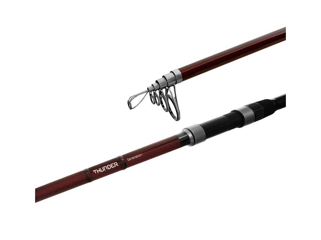 Univerzální teleskopický prut THUNDER, který si za několik let vybudoval pověst doslova nezničitelného nástroje pro lov ryb přichází v novém hávu s označením GenerationX. Základem tohoto prutu je velmi silný uhlíkový blank, který si poradí s plnou zátěží při nahazování, ale také při zdolávání kapitálních úlovků. Jednotlivé díly jsou osazeny pevnými očky se SiC výplní, které díky svému rozložení ideálně vedou vlasec a minimalizují tření. Použité DPS sedlo spolehlivě udrží na svém místě i největší navijáky. Délka rukojeti je srovnatelná s klasickými dělenými kaprařskými pruty, což umožňuje pohodlné a daleké nahazování. Na konci je rukojeť opatřena rozšířenou EVA pěnou, kvůli komfortnějšímu úchopu a snazší manipulaci. Jasným rozpoznávacím znakem tohoto modelu je charakteristická bordó barva. Oproti předchozí verzi jsme sérii THUNDER rozšířili o nové kompaktnější délky a to 300 a 330 cm. Technické parametry: Model: 300cm/100g Počet dílů: 5 Počet oček: 5 Průměr blanku nad rukojetí: 19,65mm Hmotnost: 306g Transportní délka: 120cm Rukojeť: dělená, EVA pěna Délka rukojeti (od spodní části prutu po střed sedla): 55,5cm Model: 330cm/120g Počet dílů: 5 Počet oček: 5 Průměr blanku nad rukojetí: 19,67mm Hmotnost: 338g Transportní délka: 124,5cm Rukojeť: dělená, EVA pěna Délka rukojeti (od spodní části prutu po střed sedla): 58,5cm Model: 360cm/140g Počet dílů: 6 Počet oček: 5 Průměr blanku nad rukojetí: 22,49mm Hmotnost: 430g Transportní délka: 121cm Rukojeť: dělená, EVA pěna Délka rukojeti (od spodní části prutu po střed sedla): 66,5cm Model: 390cm/140g Počet dílů: 6 Počet oček: 5 Průměr blanku nad rukojetí: 22,42mm Hmotnost: 440g Transportní délka: 124cm Rukojeť: dělená, EVA pěna Délka rukojeti (od spodní části prutu po střed sedla): 69cmDoplňkové parametry