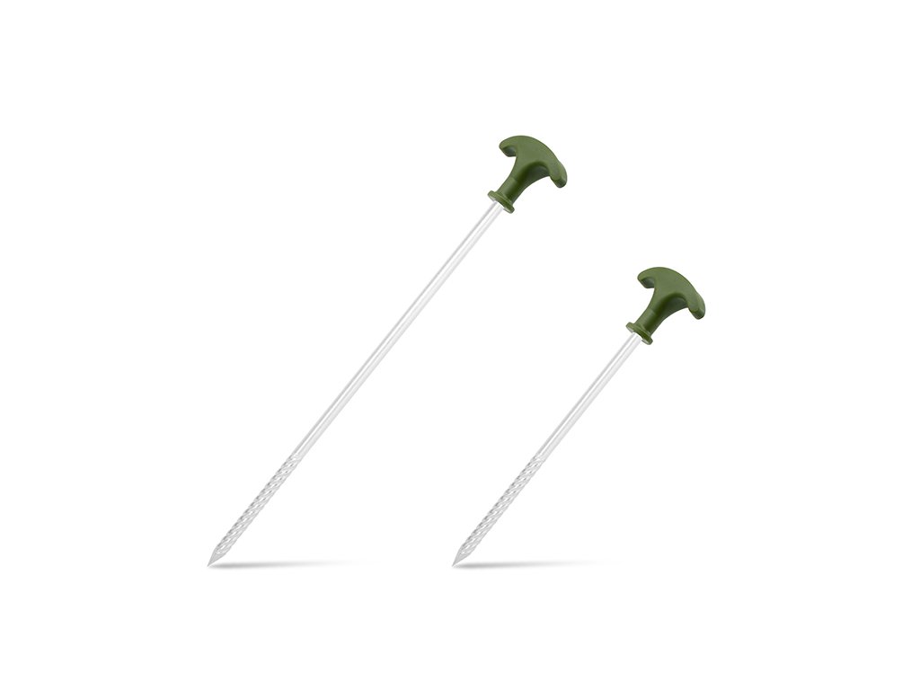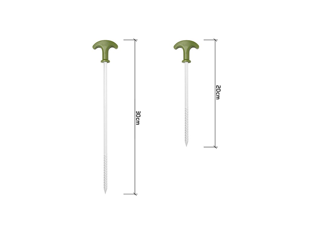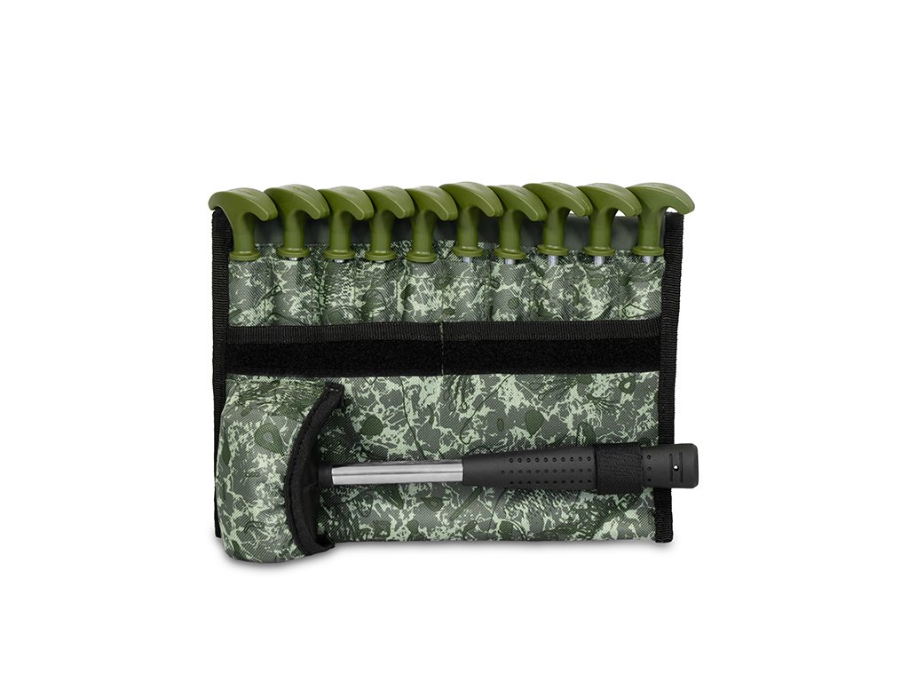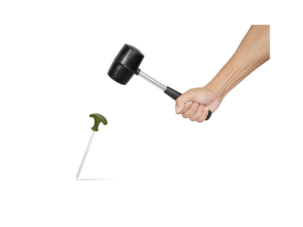 Set obsahující 10 pevných, kovových kolíků s kladivem v praktickém pouzdru s C2G designem. Kolíky disponují plně uzavřenými plastovými hlavami zelené barvy, jejichž výhodou je, že se ani po delší době zabíjení do země nezačnou uvolňovat a sesouvat po kovové části směrem dolů. Vrták s odolným čtyřhranným hrotem napomáhá jednoduššímu zapíchnutí do tvrdé a suché půdy. Hroty jsou při koupi opatřeny transparentními ochrannými krytkami pro zvýšení bezpečnosti. Součástí balení je také pryžové kladivo s kovovou nohou a gumovou rukojetí černé barvy, sloužící pro snazší zabití kolíků do země. Samotné pouzdro je vyrobeno z odolné tkaniny, která je z vnitřní strany pogumovaná. Kladivo i kolíky jsou v pouzdru během transportu fixovány, takže nehrozí nechtěná ztráta kterékoli součásti balení. Technické parametry: Rozměry pouzdra: 27x22cm Délka kolíků: 20 cm Délka závitu: 7 cm Průměr ocelové tyče: 7 mm Počet kusů v balení: 10Doplňkové parametry