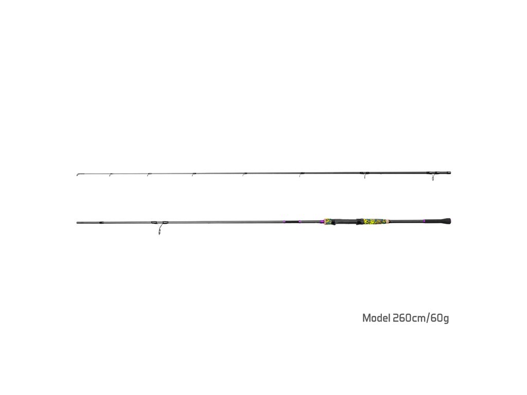 Zhypnotizujte všechny velké dravce! Pruty pro všechny, kterým nic neříkají zažité konvence. Na první pohled upoutá rukojeť, která je tvořena barevnou kamufláží s použitím barev zářivá zelená, hnědá a zelená. Nad touto "hypnotickou" rukojetí najdeme decentní korkové detaily a v celé spodní třetině prutu najdeme i fialové zdobení vyvázané nití. Matný šedý blank a černé vázání oček činí z tohoto prutu elegantního společníka u vody, zatímco moderně laděná spodní část okamžitě upoutá pozornost. Poloparabolická akce na tužším blanku činí z tohoto modelu velmi účinnou zbraň na velké dravce, které prut dokáže pohodlně vypružit v celé své délce a klidně zdolat i srdnaté štiky či menší sumce. Technické parametry: Model: 210cm / 60g Počet dílů: 2 Počet oček: 8 Průměr blanku nad rukojetí: 10mm Transportní délka: 110cm Hmotnost: 120g Rukojeť: EVA pěna a NEO-FOAM Délka rukojeti (od spodní části prutu po střed sedla): 33cm Model: 240cm / 60g Počet dílů: 2 Počet oček: 8 Průměr blanku nad rukojetí: 11mm Transportní délka: 125cm Hmotnost: 150g Rukojeť: EVA pěna a NEO-FOAM Délka rukojeti (od spodní části prutu po střed sedla): 36cm Model: 260cm / 60g Počet dílů: 2 Počet oček: 9 Průměr blanku nad rukojetí: 11mm Transportní délka: 135cm Hmotnost: 164g Rukojeť: EVA pěna a NEO-FOAM Délka rukojeti (od spodní části prutu po střed sedla): 37cm Model: 300cm / 60g Počet dílů: 2 Počet oček: 8 Průměr blanku nad rukojetí: 17mm Transportní délka: 155cm Hmotnost: 200g Rukojeť: EVA pěna a NEO-FOAM Délka rukojeti (od spodní části prutu po střed sedla): 39cmDoplňkové parametry