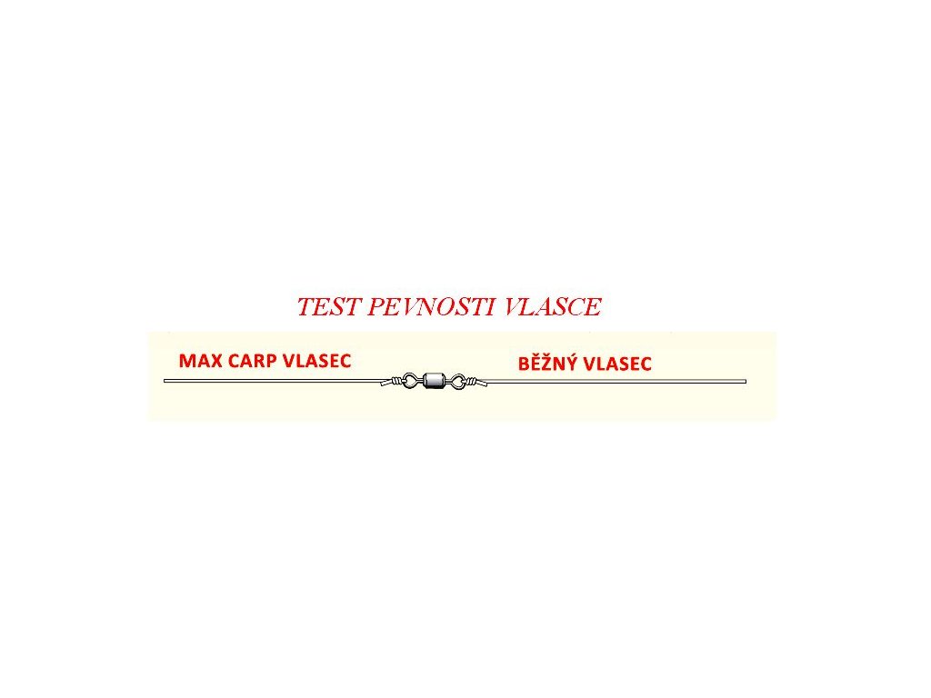 V pípadě jakýchkoliv pochybností v pevnost vlasce stačí udělat jednoduchý test, který spočívá v tom, že na jednu stranu obratlíku uvážete vlasec Max Carp a na druhou stranu kterýkoliv jiný vlasec stejného průměru a tímto testem se sami přesvědčíte o neuvěřitelné síle tohoto vlasce, který vás nikdy nezklame!!