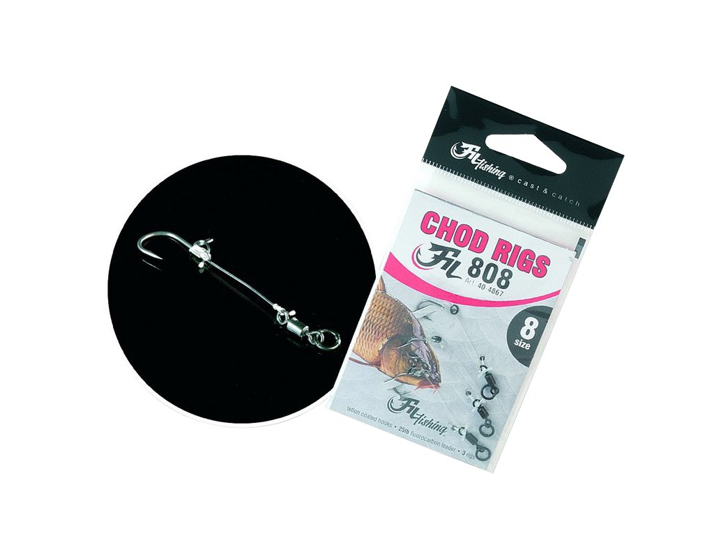 Rybaření s universálním návazcovým systémem Chod Rig je jednoduše senzací. Ručně vázaný kvalitní návazec na Fluorocarbonu nosností 25 lb ( 11,34 kg ), který je osazen kvalitními háčky. Je to všestranný hotový návazec, který je ideální pro všechny typy vod. Ať už to jsou různá jezera, rybníky, nebo dokonce řeky. Chod Rig je stal skutečnou celebritou mezi ostatními kompletními návazci.