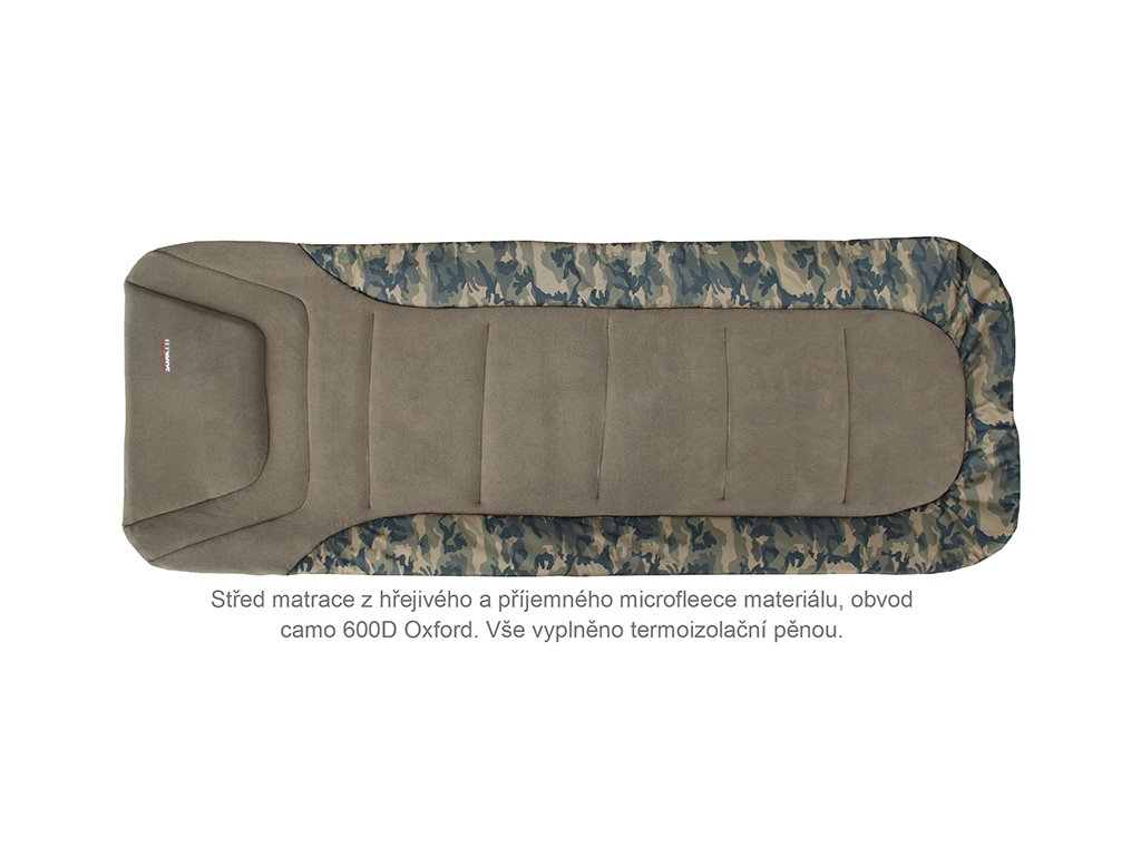 <p>Ploché lehátko Promaster Camo poskytuje velmi vysoký komfort, který bude<br />konkurovat i spaní, které máte doma. Promaster Camo je šestinohé ploché lehátko (bez kloubu) se stabilitou osminohého lehátka. Unikátní rozložení tří páru noh umožňuje sezení po celé délce lehátka. Nohy mají aretaci proti sklopení. Střed matrace je s micro fleece a po obvodě camo 600D Oxford a to celé vyplněno termoizolační pěnou. Matrace s polštářem je na konstrukci v prostřední části vyztužena pro větší pohodlí. V transportní poloze je lehátko fixováno popruhem.</p> <p>6x noha<br />Ocelová konstrukce<br />Aretace nohou - nehrozí zhroucení lehátka<br />Nohy s packou s antismykovou dosedací plochou<br />Matrace je ve střední části vyztužena, pro větší pohodlí.<br />Rozměr matrace 212x80cm<br />Transportní rozměry 82x83x25cm<br />Nosnost 150kg<br />Váha 9,5kg</p> <p></p>Doplňkové parametry