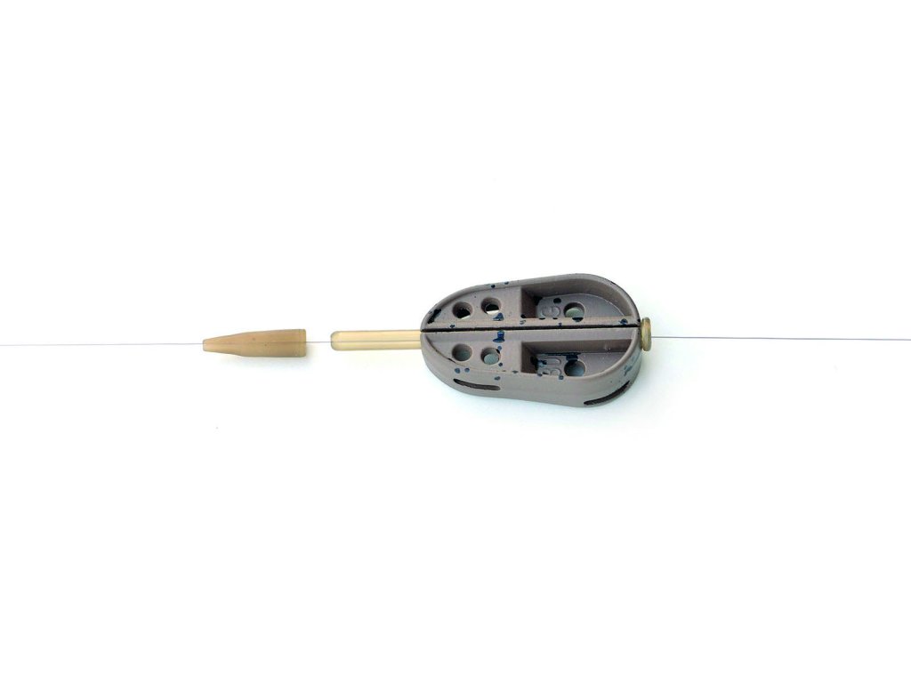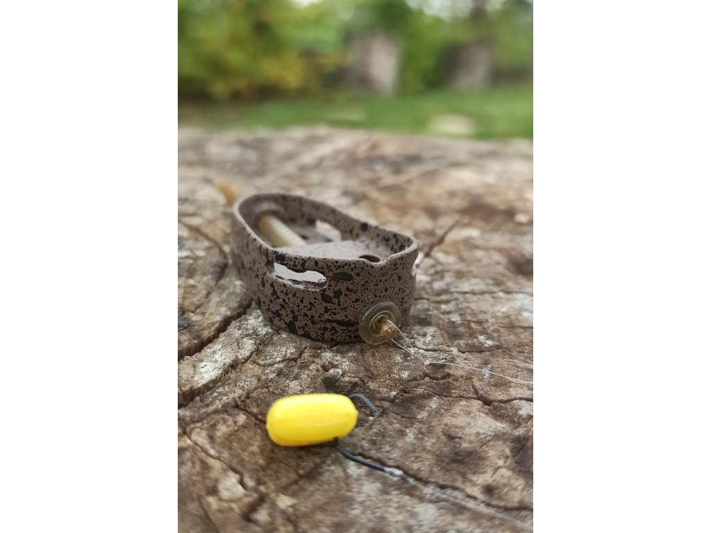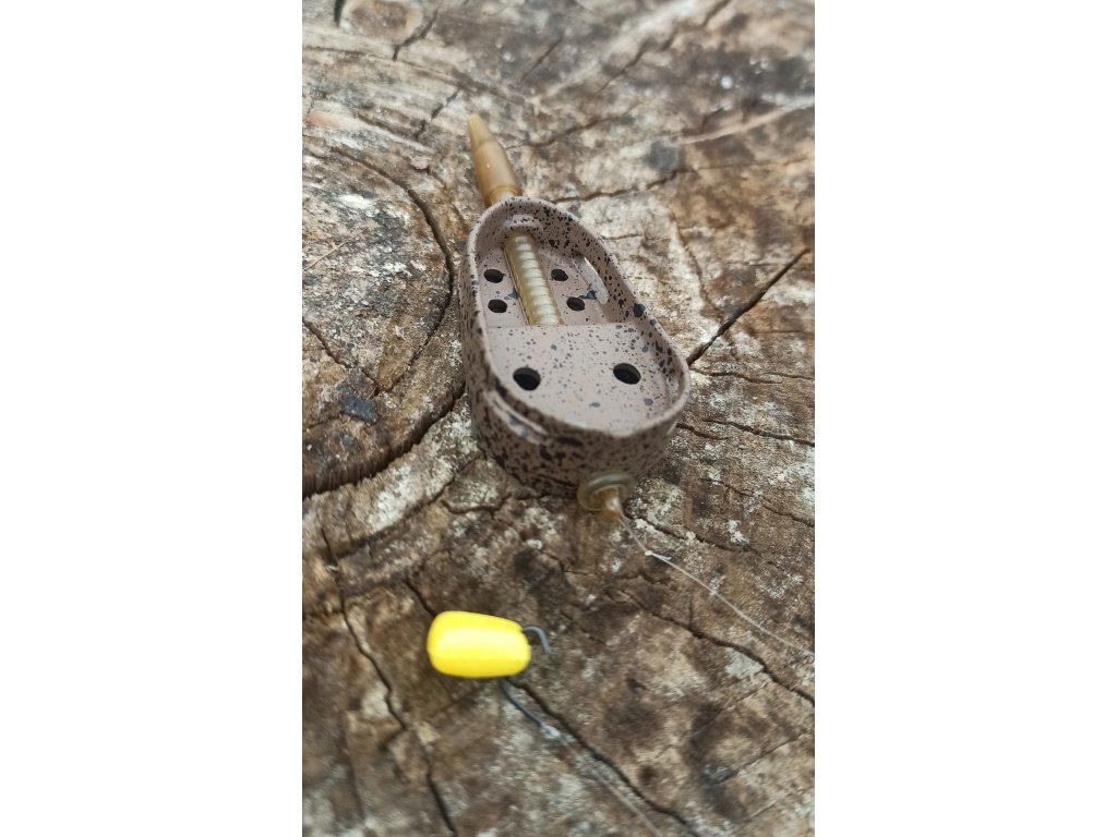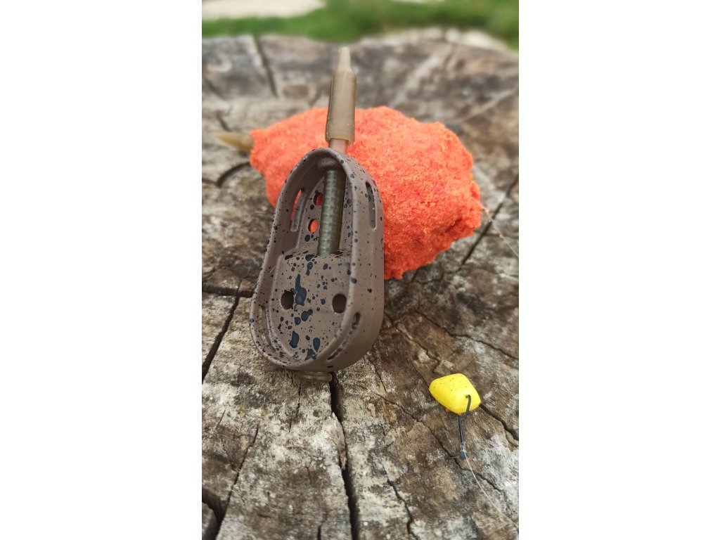 Nové vyměnitelné luxusní a precizně zpracované method krmítko Quick Change Flat s olověnou zátěží pro lepší fixací v proudící vodě. Představuje dokonalé sloučení method a pellet feederového lovu. Důmyslné tělo z jednoho dílu je vhodné i pro ty nejnáročnější situace. Otvory v základně a v bočních stěnách umožňují snadné plnění, rychlé uvolnění návnady, vyvýšené strany jsou speciálně navrženy tak, aby chránily návnadu při nárazu a udržely ji pohromadě. Tento desing umožňuje dokonalý dopad při každém hodu. Hlavní výhodou tohoto nového modelu je však kompletní možnost výměny za jinou gramáž, nebo sundání olova před transportem, aby nedošlo k poškození blanku vašich prutů. Po vysunutí průběžné trubičky lze celé krmítko snadno stáhnout z vlasce skrze průřez na zadní straně ! Krmítko je primárně určeno k použití v průběžné sestavě, avšak za pomocí obratlíku či gumového korálku se může zafixovat a tím nám vznikne buď pevná nebo poloprůbežná montáž. Vnitřní trubička je totiž přesně navržená pro zafixování pevnostního obratlíku vel. 8. Hnědo-černé barevné provedení zajišťuje dokonalé maskování na většině typů dna.