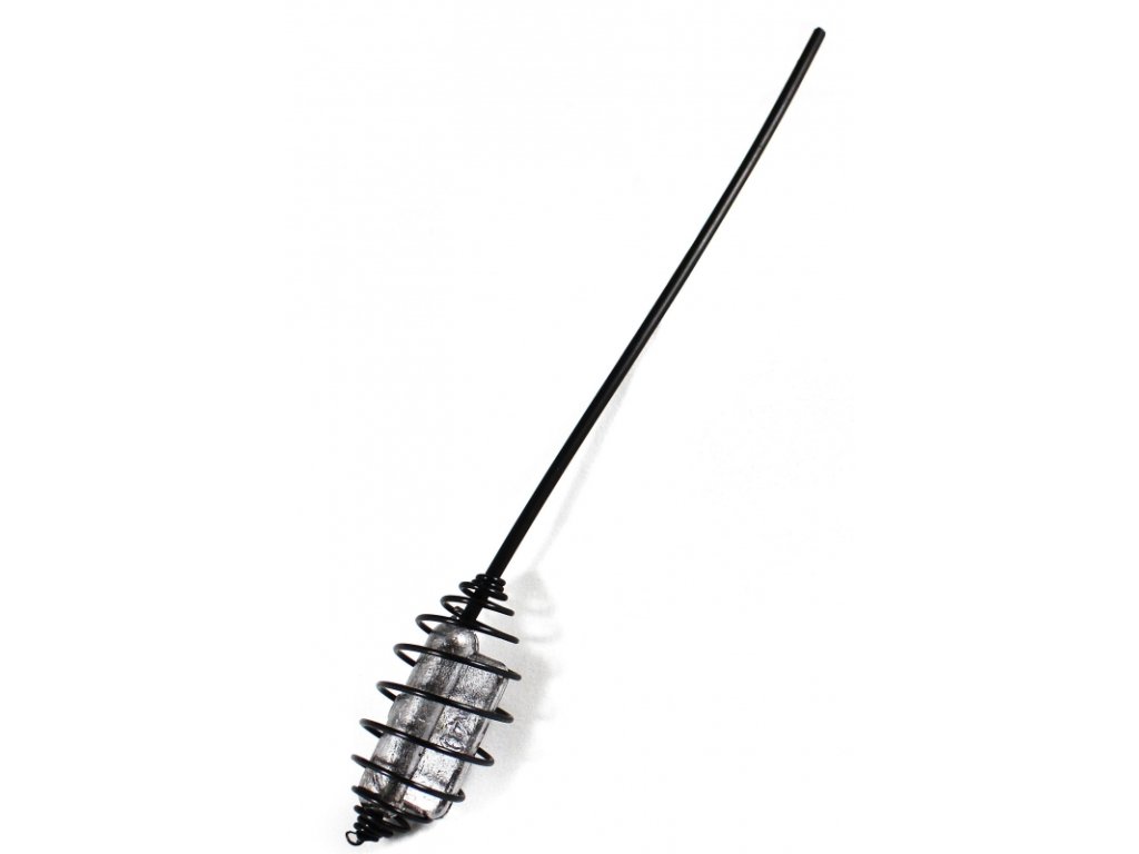 Krmítko průběžné s excentrickým olovem a dlouhou trubičkou. Excentrické olovo zabraňuje kroucení vlasce a dlouhá trubička brání zamotání při náhozu.