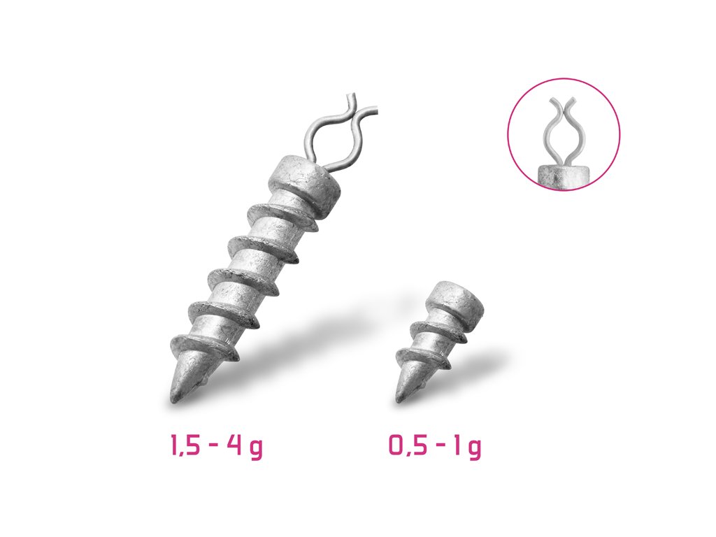 Zavrtávací závaží slouží ke snadnému dovažování měkkých umělých nástrah bez potřeby opětovného nastražování nástrahy. Zároveň díky ocelovému klipu plní také funkci nástrahového ostnu. Závaží tvarované do tvaru šroubu s výrazným závitem umožňuje spolehlivé umístění zátěže do spodní strany nástrahy. Pevnost spoje lze zvýšit aplikováním vteřinového lepidla na závit těsně před jeho zašroubováním. Závaží je ideální pro použití s hotovými systémy TwistoRIGS nebo obecně s různými systémy s trojháčky.Doplňkové parametry