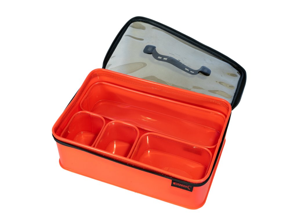 Feeder Expert EVA Method Feeder Set 4+1 o celkovém rozměru 37 x 25 x 12 cm je velmi praktické pouzdro, které je určeno na krmítka, různé pomůcky, a především návnady a nástrahy na feeder a method feeder. Lze je v něm převážet, míchat nebo vlhčit. Při chytání je pak budete z jednotlivých částí snadno nabírat. Jedna dlouhá, jedna střední a dvě menší vnitřní části vám umožní připravit si různé typy nástrah a návnad. Velkou výhodou je, že EVA materiál je velmi odolný, omyvatelný a voděodolný. Díky tomu jednotlivé části po použití snadno vyčistíte. Průsvitná vrchní část vám umožní poznat, co se v pouzdru nachází. Vrchní madlo usnadňuje přenášení.