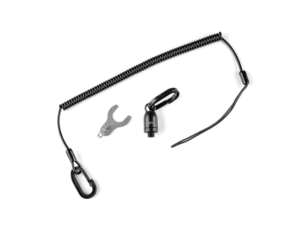 Otočná očka o 360 stupňů, dvě karabiny pro maximální komfort odepínání například při focení s rybou. Ocelové pojistné lanko potažené gumou.