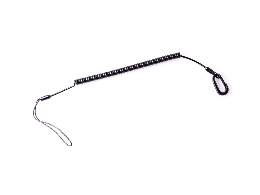 Druhá strana ocelového lanka potaženého gumou je vybavena tkanou smyčkou, která se provleče za poutko u opasku nebo na místě kde chcete mít podběrák zajištěný.