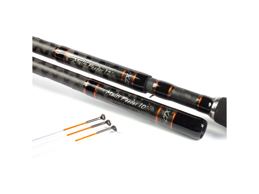 CTX Multi feeder pruty umožňují přidáním nebo odebráním vloženého dílu měnit délku z 3,05m na 3,66mm, respektive z 3,35m na 3,96m. To z nich činí velmi univerzální pruty, kdy rybář může snadno přizpůsobit prut podmínkám a velikosti revíru. Akce prutů je Medium. Výborně se s nimi nahazuje a mají perfektní zdolávací akci. Jejich vlastníci se mohou těšit na laserem broušenou bezlakovou úpravu blanku, sedlo FUJI VSS16 (CTX) očka Single Leg Anti-Frap. Rukojeť je vybavena prvotřídním korkem a nad sedlem japonskou EVA gumou. U každého prutu jsou tři různě silné špičky. Pruty jsou dodávány v kvalitních obalech nahoře i dole uložené do neoprénových chrániček. Špičky jsou značeny v oz (unce), buď ze sklolaminátu, nebo plného carbonu.CTX Multi Feeder 10‘-12‘- H 169-212g, Z 50g, F 1G, 1 a 2