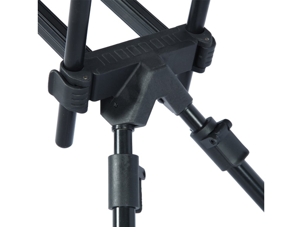 Robustní dvojitá konstrukce z hliníkové slitiny s černou povrchovou úpravou. Jak přední, tak zadní nožičky, jsou výškově nastavitelné a hlavně mají tři polohy úhlů nastavení, což Vám zajistí, že stojan dáte do požadované polohy i na nerovném povrchu. Přední a zadní hrazdy na 3 pruty. Snadné složení a malé přepravní rozměry do 58 cm. Je dodáván včetně přepravního obalu. - Barva: černá - Transportní ozměry: 58 x 20 x 13 cm - Váha: 1,75 kg Specifikace: - Hliníkové tělo - Délka hrazd: 40 cm - Celková délka: 80 cm - Minimální délka: 46 cm - Minimální výška: 27 cm - Minimální výška s hrazdami: 36 cm - Maximální výška s hrazdami: 57 cm Odkaz na video: http://www.youtube.com/watch?v=Je69zmTscGoDoplňkové parametry