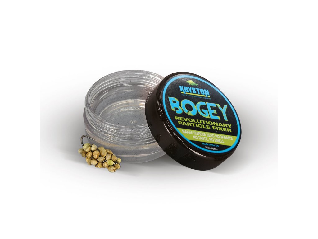 Bogey je vazká tekutina, spíše tekuté lepidlo, na slepování drobných zrnek partiklu při vytváření nástrah.Postup_ Vytvořte si z Bogey kuličku dle libosti, pořádně ji promněte a poválejte v ruce, aby se zahřála. Připravte si drobný suchý partikl a kuličku jím obalte, případně jej do Bogey kuličky vtlačte. Poté nechte nějakou dobu ve vodě, kde Bogey lepidlo postupně ztmavne. Poté kuličku propíchněte boilie jehlou, navlékněte ji na přívěs pod háčkem a zajistěte zarážkou. Pozor, nástraha z Bogey je plovoucí! Vždy pracujte s čistými rukami! Vhodným partiklem jsou především malá zrnka, jako je konopí, pšenice, řepka, ale i všechna možná malá semínka.
