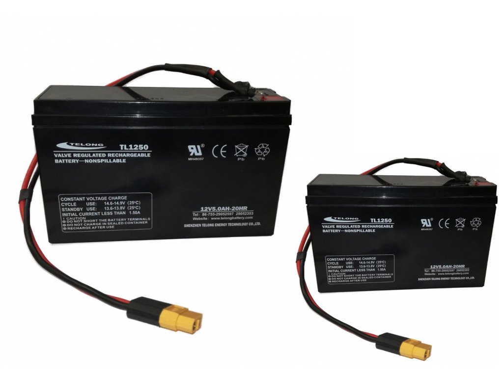 Sada dvou olověných akumulátorů, které jsou určeny pro nejnovější verzi závážecí lodičky Carp Scout.Sada dvou olověných akumulátorů 12V / 5Ah pro zavážecí lodičky Carp Scout LA.