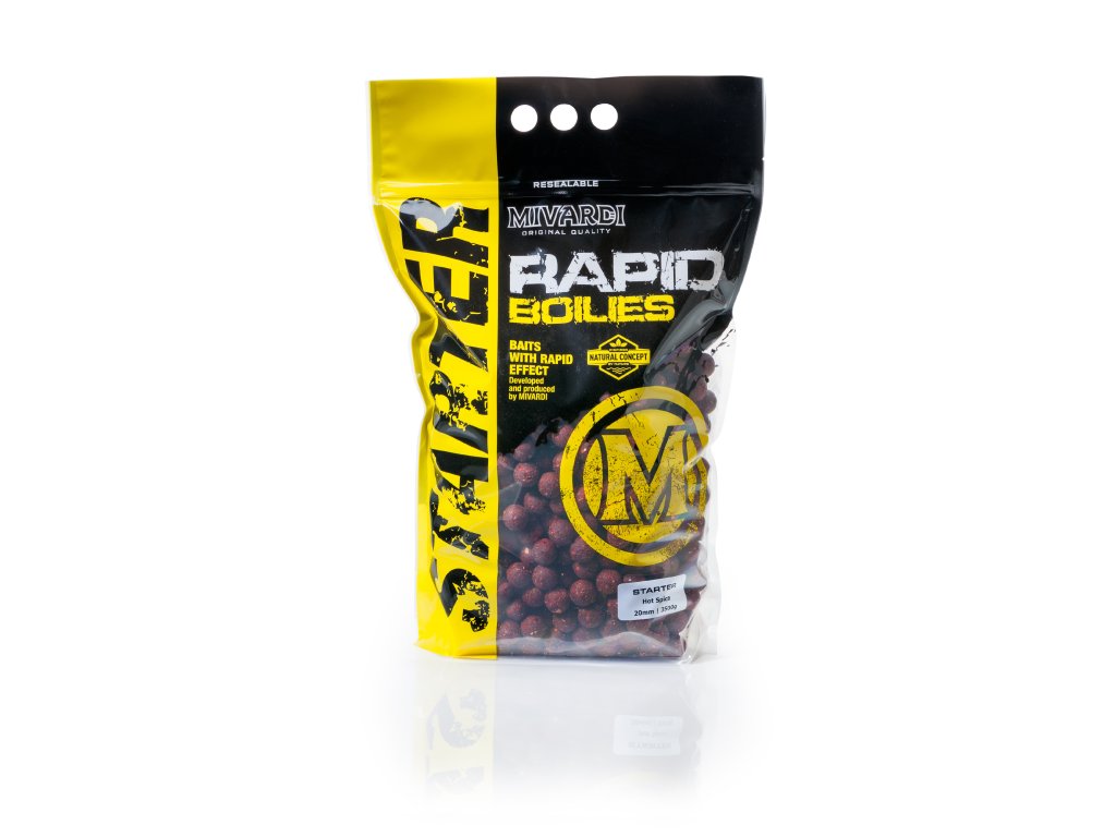 Vysoce atraktivní boilies, vyrobené z dobře stravitelných komponent, ptačích zobů, rybích extraktů a skutečných vajec. Vyznačuje se poctivým, naturálním vzhledem a bohatou strukturou. Neobsahuje žádná barviva ani umělá pojiva či jiné náhražky. Velmi dobře pracuje i ve studené vodě. Ihned po nahození se začíná pomalu rozpouštět a uvolňovat drobné částečky. Přináší větší počet záběrů při kratších vycházkách. Zároveň je velmi vhodné pro masivní pravidelné vnadění, když potřebujete na lovném místě udržet větší množství kaprů. Velkým trumfem boilies STARTER je jeho mimořádně výhodná cena. Toto boilies je dostupné ve skvěle vyladěné osvědčené příchuti Monster & Halibut, ve sladké verzi Fruit Bomb tvořené osvědčeným mixem účinných ovocných esencí a neodolatelně pikantní vůní Hot spice, která během dlouhého testování dosahovala neskutečných úlovků kaprů.Doplňkové parametry