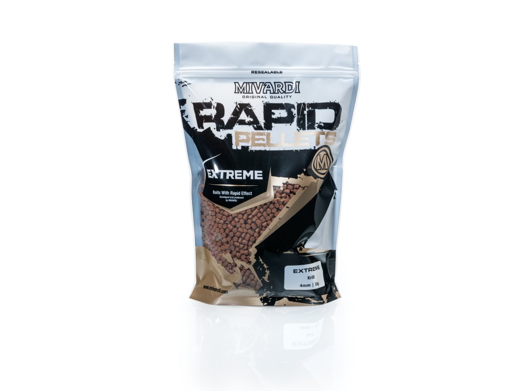 Řada skutečně extrémních pelet. Jsou vyrobeny zcela bez přídavku esencí. I přesto mají silné aroma, které vždy vychází z hlavní složky, použité v konkrétním druhu pelety. Maximální množství složek je před výrobou extrudováno pro zajištění výborné stravitelnosti. Tradičně rychlá účinnost pelet se v případě řady Rapid Extreme s vyšší selektivností, obvyklou u nejvyšších sérií boilies.Rapid pelety Extreme – Krill