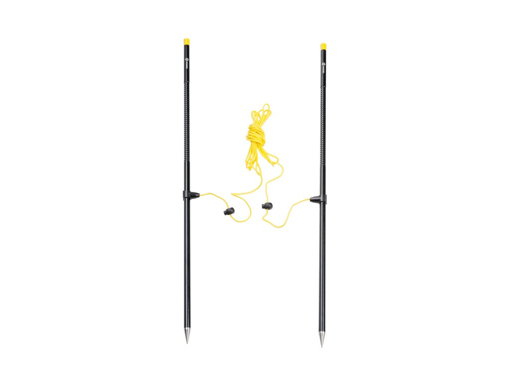 Precizně zpracované, pevné distanční tyče s prodlouženými hroty, frézovanými z nerezové oceli. Ty jsou mimořádně odolné a zajišťují snadné zapíchnutí ve tvrdém či kamenitém podkladu. Anatomicky tvarované koncovky v typicky žluté Mivardi barvě zajišťují dobrou viditelnost při při použití v horších světelných podmínkách a chrání dlaň při zapichování tyčí. Na povrchu tyčí jsou frézované drážky pro bezpečné zachytávání smyček vlasce. Rozteč mezi tyčemi lze přesně nastavit pomocí dobře viditelné žluté šňůry, zakončené nastavitelnými klipy pro rychlé nacvaknutí na tyč. Součástí dodávky je i přepravní pouzdro.Doplňkové parametry