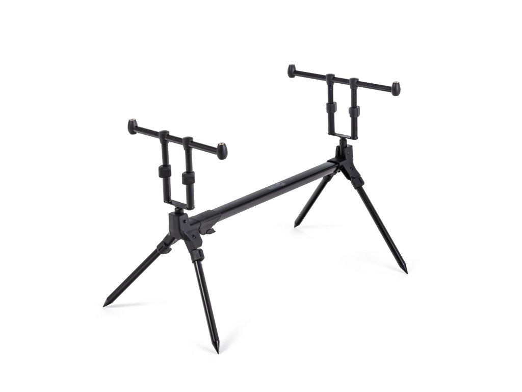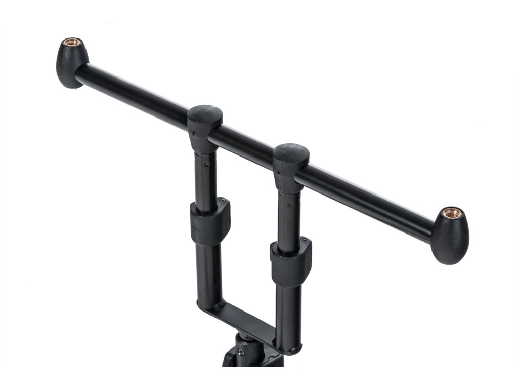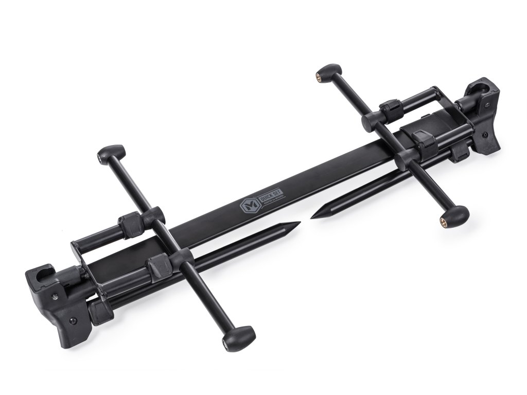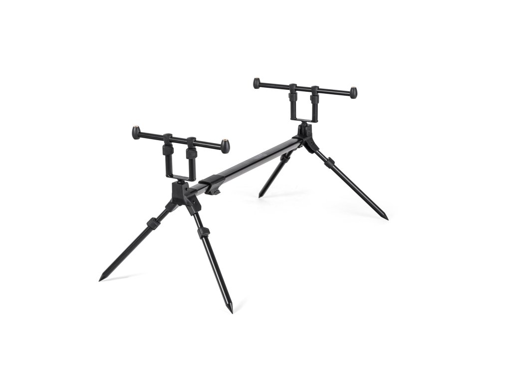 Kompaktní, lehký a dokonale stabilní stojan na pruty s unikátním systémem rychlého skládání. Nepotřebujete žádné šrouby. Rozložení všech částí, nastavení délky či vyklopení teleskopických noh je otázkou několika vteřin. Vše je řešeno unikátním systémem na zacvaknutí. Stojan je vybaven hrazdami na dva pruty s nastavitelnou výškou. Nastavit můžete i délku stojanu a samozřejmě i délku teleskopických noh. Stojan je ideální pro lov s krátkými stalkerovými pruty. V případě potřeby je možné stojan osadit hrazdami na tři pruty, dostupnými samostatně.Min/max délka přední nohy 30/53 cm