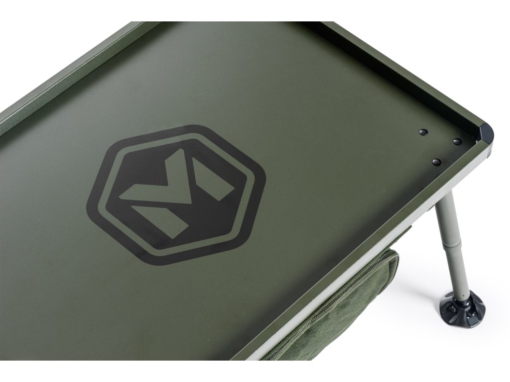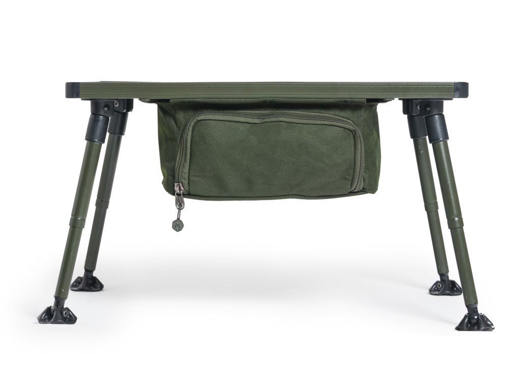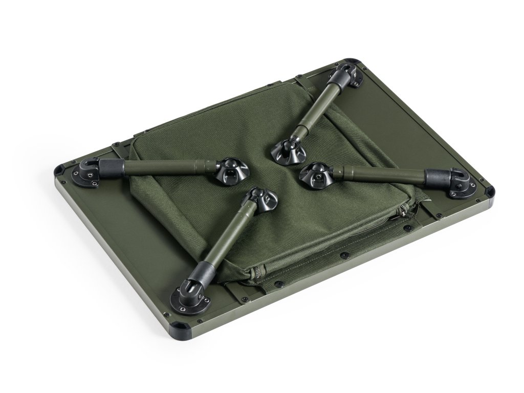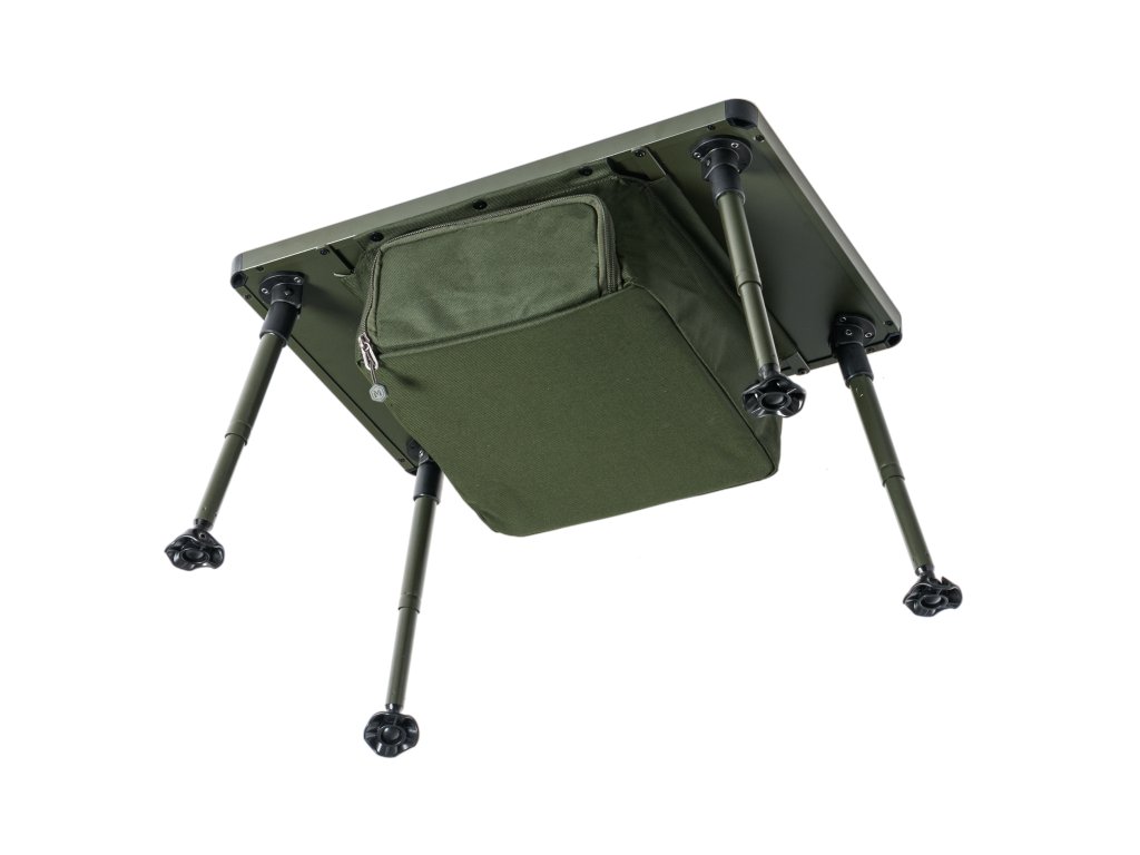 Nově navržený bivakový stolek větší velikosti s úložným prostorem pod deskou. Úložný prostor je uzavíratelný na zip a jeho dno je zpevněno lehkou ale dostatečně tuhou deskou. Celokovová konstrukce hlavní desky je zárukou tuhosti a dlouhé životnosti. Teleskopické nohy jsou vybaveny luxusními výkyvnými patkami a systémem rychlé aretace výsuvu. Dovolují zároveň postavení stolku v nadstandardní výšce. Velmi snadné je i vyklápění a sklápění noh. Stolek je dodáván v praktickém přepravním pouzdře s uchy na přenášení.Doplňkové parametry