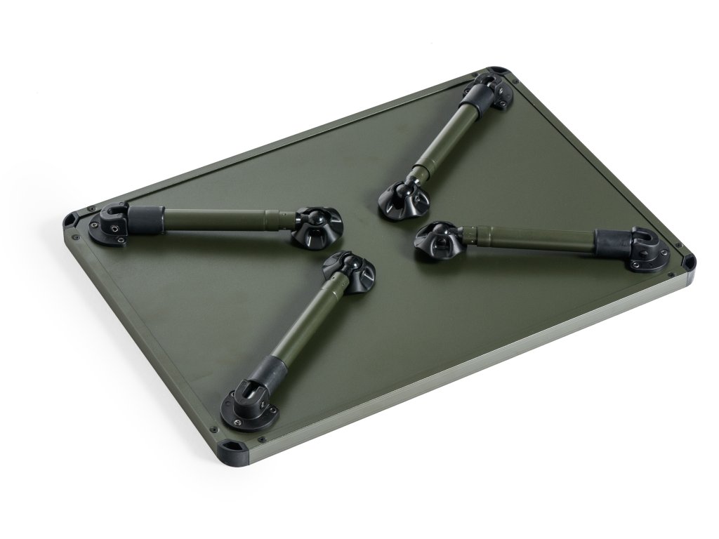 Nově navržený bivakový stolek větší velikosti. Celokovová konstrukce hlavní desky je zárukou tuhosti a dlouhé životnosti. Teleskopické nohy jsou vybaveny luxusními výkyvnými patkami a systémem rychlé aretace výsuvu. Dovolují zároveň postavení stolku v nadstandardní výšce. Velmi snadné je i vyklápění a sklápění noh. Stolek je dodáván v praktickém přepravním pouzdře s uchy na přenášení.Doplňkové parametry