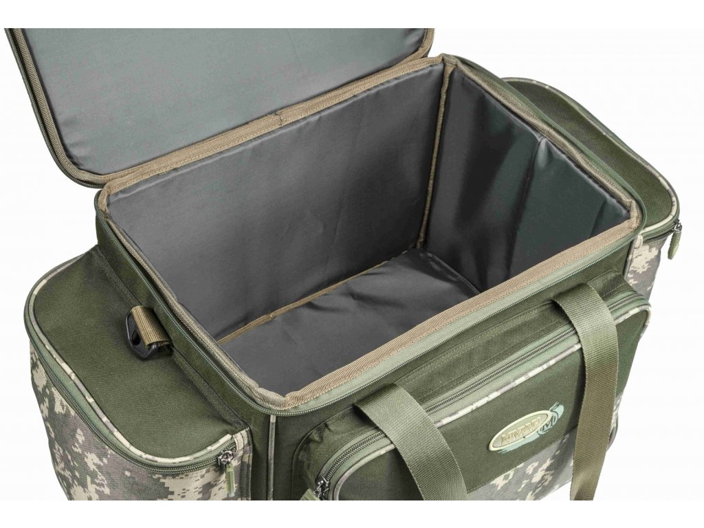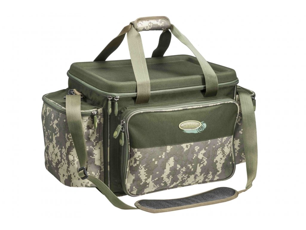 Precizně zpracovaná přepravní taška v atraktivním designu digitálního maskáče s prostornými bočními kapsami. Tvrzené víko slouží jako stolek na drobné příslušenství. Luxusní polstrovaný popruh umožňuje pohodlné nošení přes rameno.Rozměr velké hlavní části 40 x 30 cm