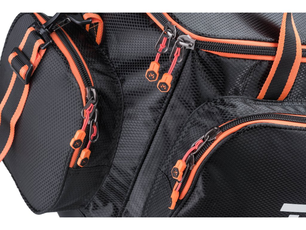 Velká a pevná přepravní taška pro přepravu vaniček, misek, držáků prutů, systémových boxů a dalších doplňků, které potřebujete při lovu na feeder nebo plavanou. Hlavní komora i všechny kapsy jsou díky použitému matreriálu výrazně vyztužené. Taška je opatřena pevnými uchy pro nošení v ruce a nastavitelným luxusním popruhem přes rameno s extrémně silným polstrováním. To zajišťuje dokonalý komfort při jejím nošení i v případě plného naložení. Obaly tašky a další zavazadla série TMX jsou vyrobeny z prémiového, extrémně silného materiálu s luxusním designem ve stylu splétaného carbonu. Tento materiál je zcela nepromokavý a výborně omyvatelný. Na celé sérii TMX jsou použity zátěžové zipy nejvyšší kvality s praktickými táhly Mivardi.