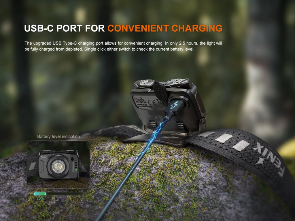 Pro nabíjení odklopte gumovou krytku na zadní straně čelovky a připojte USB-C nabíjecí kabel. Po dokončení nabíjení krytku opět nasaďte, aby byla zachována voděodolnost. Plné nabití zcela vybité čelovky trvá přibližně 2,5 hodiny při použití USB adaptéru 5 V / 1 A. Během nabíjení lze čelovku používat pouze v nízkém režimu libovolného reflektoru. Průběh nabíjení signalizují čtyři LED indikátory – po jejich trvalém rozsvícení je nabíjení dokončeno.