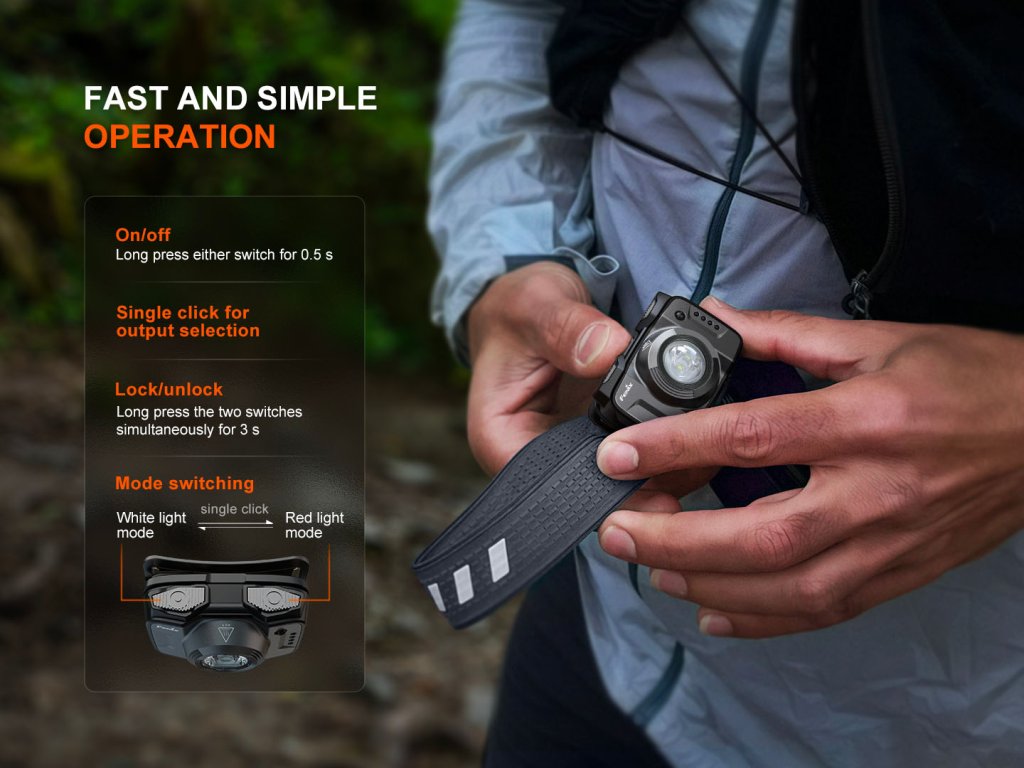 Čelovka si zachovává vysokou odolnost i v nepříznivých podmínkách – splňuje normu IP66, takže bez problémů odolá silnému dešti. Hlavový popruh je vybaven reflexními prvky pro lepší viditelnost za tmy a silikonovým proužkem na vnitřní straně, který zabraňuje sklouzávání a zajišťuje pohodlné a stabilní usazení na hlavě i při dynamickém pohybu.