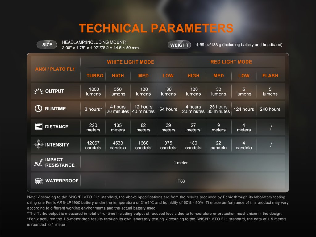 Veškeré parametry čelovky (světelný tok, výdrž, voděodolnost, dosvit i nárazuvzdornost) jsou měřeny v souladu s normou ANSI/NEMA FL 1-2009.