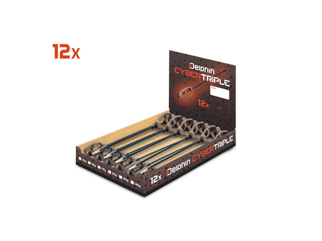 Delphin CyberTriple je určeno zejména pro rybáře, kteří mají v oblibě lov na položenou s krmítkem. Jeho aerodynamický tvar zaručuje spolehlivé a přesné doručení nástrahy i do vzdálenějších částí revíru. Olověné tělo CyberTriple tvoří 3 hranatá žebra, která zaručují přesnější trajektorii a dokonale udrží návnadu v krmítku během letu, i při dopadu na lovné místo. Během vývoje tohoto krmítka, jsme však navíc zapracovali hned několik inovací. Velkou výhodou je zajišťovací gumová bužírka, která zamezí aby se olověné tělo krmítka při nahazování posunulo. Trubička je kompatibilní s obratlíky vel. 4 z naší nabídky, které do ní dokonale zapadnou a zaručí, že vaše návnada bude poblíž nástrahy. Povrch CyberTriple je chráněn barvou v přírodních odstínech hnědé s černými frkanci. Tyto barvy dokonale kamuflují krmítko i po rozpadnutí vnadící směsi. PROTECTED DESIGN - Tento produkt byl kompletně navržen designéry značky Delphin. Jeho design a technické řešení jsou natolik unikátní, že je registrován a chráněn na území celé Evropské unie.Doplňkové parametry