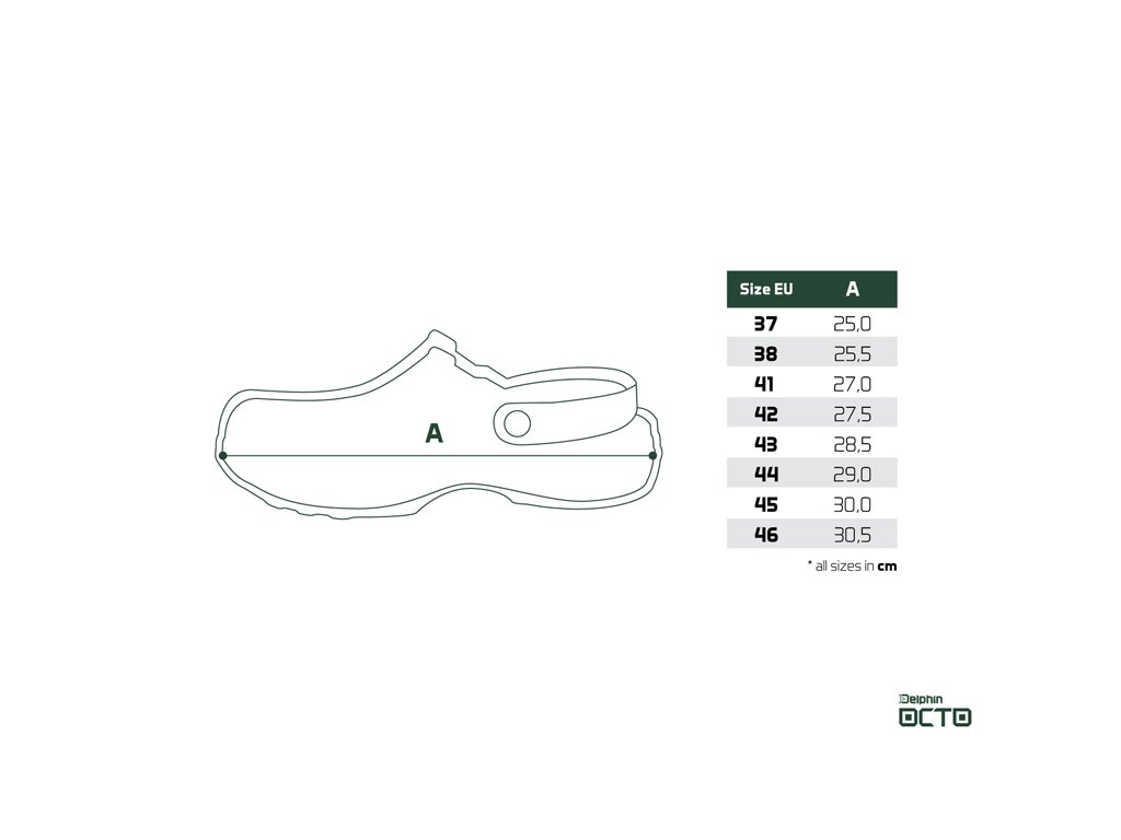 Od počátku vývoje tohoto produktu bylo naším záměrem přinést designově jedinečné vsuvky, které budou splňovat požadavky rybářů na maximální funkčnost a komfort během nošení nejen na rybách, ale i v běžném životě. A výsledek? Delphin OCTO - ultra lehké pantofle z EVA pěny, inspirované přírodou, kompletně navrženy a vyráběny v Evropské unii! Vzhledem k tomu, že během rybolovu je nutné často chodit po nerovném terénu, jsme se při vývoji zaměřili na podešev, která je podstatně pevnější a masivnější ve srovnání s levnějšími konkurenčními modely. Právě to zaručuje, že chození v těchto vsuvkách bude maximálně komfortní a dokonale odfiltruje nerovnosti terénu. Při podešvi ještě chvíli zůstaneme. Právě tam začíná příběh názvu OCTO. Stylizovali jsme ji totiž do tvaru přísavek chapadel chobotnice, což zaručuje výborný grip za každých podmínek. Právě chobotnice, anglicky OCTOpus, anebo latinsky OCTOpod byly inspirací pro kompletní design a název ve zkrácené forme - OCTO. Dalším sofistikovaným prvkem jsou velké postranní otvory, jejichž prioritním úkolem je starat se o odvětrávání a celkovou vzdušnost v této obuvi. Záměrně nejsou navrženy ve výši podrážky, jak to bývá standardem, ale o něco výše. Právě tento detail hraje významnou roli během pobytu na břehu, či mělké vodě. Tím, že otvory jsou o něco vyšší nad vnitřní stélkou je téměř eliminováno nechtěné nabírání písku či kamínků mezi podrážku a chodilo. Vaše chodidla jsou tedy chráněny v maximální možné míře. Kromě těchto otvorů slouží k odvětrávání hustá perforace umístěna ve vrchní části. Ta je záměrně vytvarována na jedné straně do symbolu D z loga Delphin, na druhé vsuvce zase kraluje symbol O, jako počáteční písmeno názvu OCTO. Celkový dojem ještě zhodnocuje jemná struktura na povrchu pantoflí, která evokuje kůži chobotnice. Díky použitému EVA materiálu jsou mimořádně lehké, houževnaté a dokonce plovoucí. Samozřejmostí je u tohoto modelu poutko na fixaci paty (lidově nazývané i uzávěrka), které oceníte zejména v nerovné, či svahovitejšom terénu. Delphin OCTO jsou jednoduše stylovou letní obuví, jedinečného designu, s velmi širokým využitím. Ať už potřebujete přezůvky do interiéru, jít na ryby, vykoupat se, neboli do města. OCTO jsou tu aby vás převedli všemi nástrahami dne komfortně a s lehkostí. Jediným mínusem je, že nejsou vhodné pro vysokohorskou turistiku, to však díky ostatní všestrannosti určitě oželíte :) Jelikož jsou pantofle vyrobeny z EVA materiálu, vedle množství výhod třeba dbát i na péči o tento materiál. Nenechávejte ho proto vystaven dlouhodobě přímému prudkému slunečnímu záření na rozpálených kamenech či betonu. Právě tam může teplota atakovat až 50 stupňů Celsia, což může způsobit jemné tvarové deformace. Samozřejmě, pokud jsou pantofle na nohách, k takovému jevu nedochází a životnost se počítá na roky.Doplňkové parametry