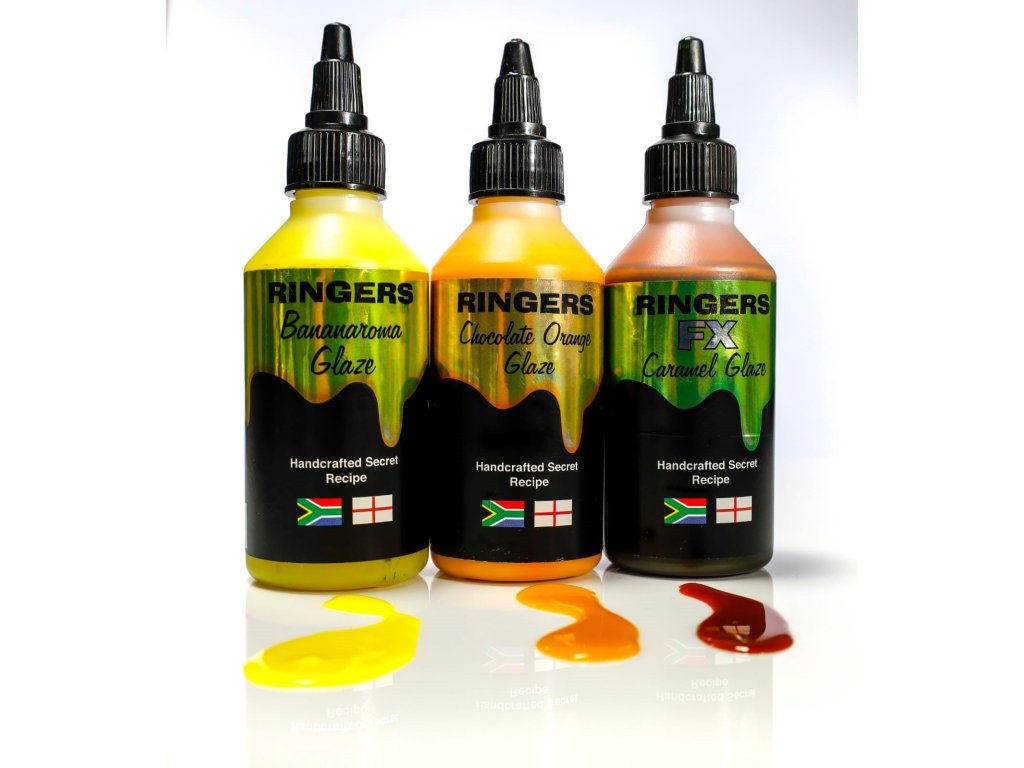 Ringers Caramel FX Glaze 100ml je tekutý atraktor s příchutí sladkého karamelu. Může být použitý k zatraktivnění nástrah i návnad především pro feeder, method feeder, krátkodobé či závodní chytání.