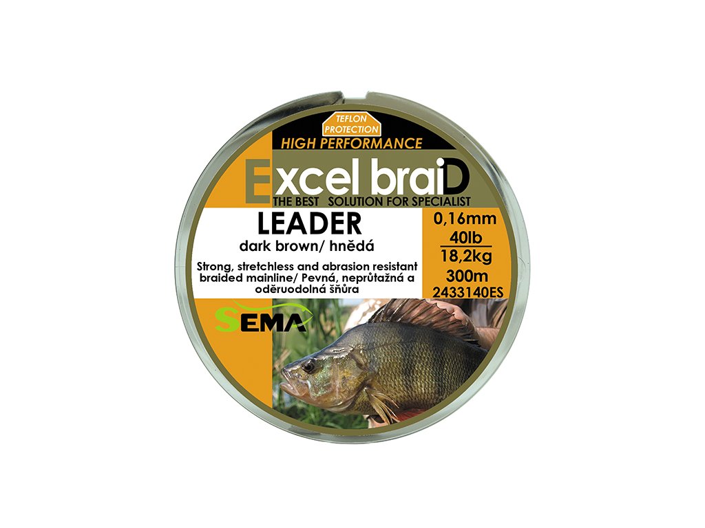 <p>Leader je šňůra pletená z 8 pramenů s Teflonovým potahem. Typ splétání a použití osmi pramenů ji dělá jemnější a lépe ohebnou. Teflonová ochrana ji zase chrání proti oděru a snižuje tření. Je tedy šetrná k očkám prutu a lépe se odvíjí z cívky navijáku, takže se s ní dosahuje delších odhozů. Návin 150m je určen hlavně k lovu na feeder, 300m k lovu na přívlač a 600m k lovu všech druhů sladkovodních dravých ryb nebo na multiplikátor při mořském rybolovu.</p> <ul> <li>Nosnost: 90,9kg</li> <li>Barva: hnědá</li> <li>Návin: 300m</li> </ul>Doplňkové parametry