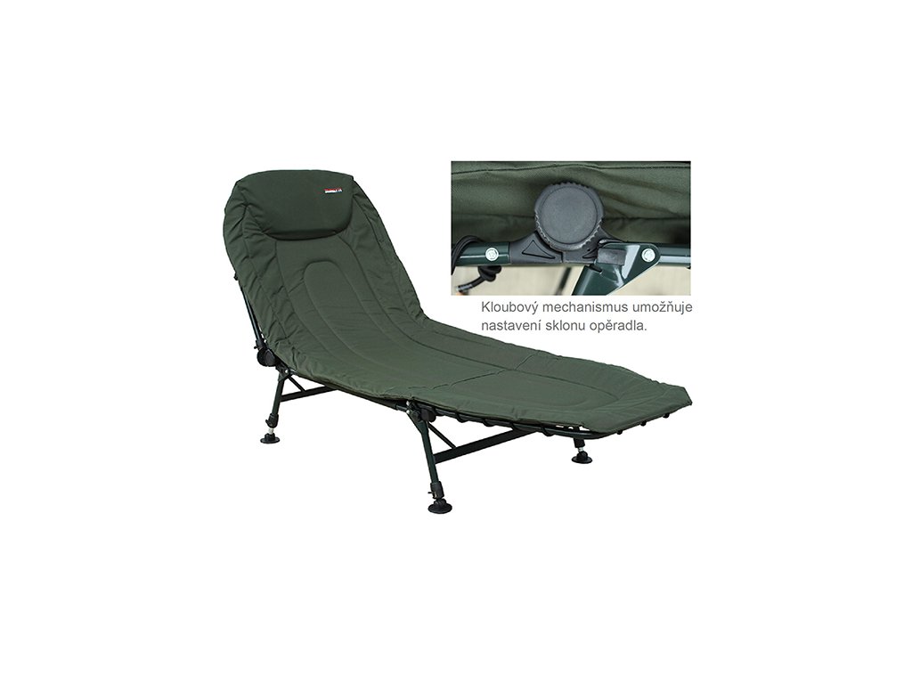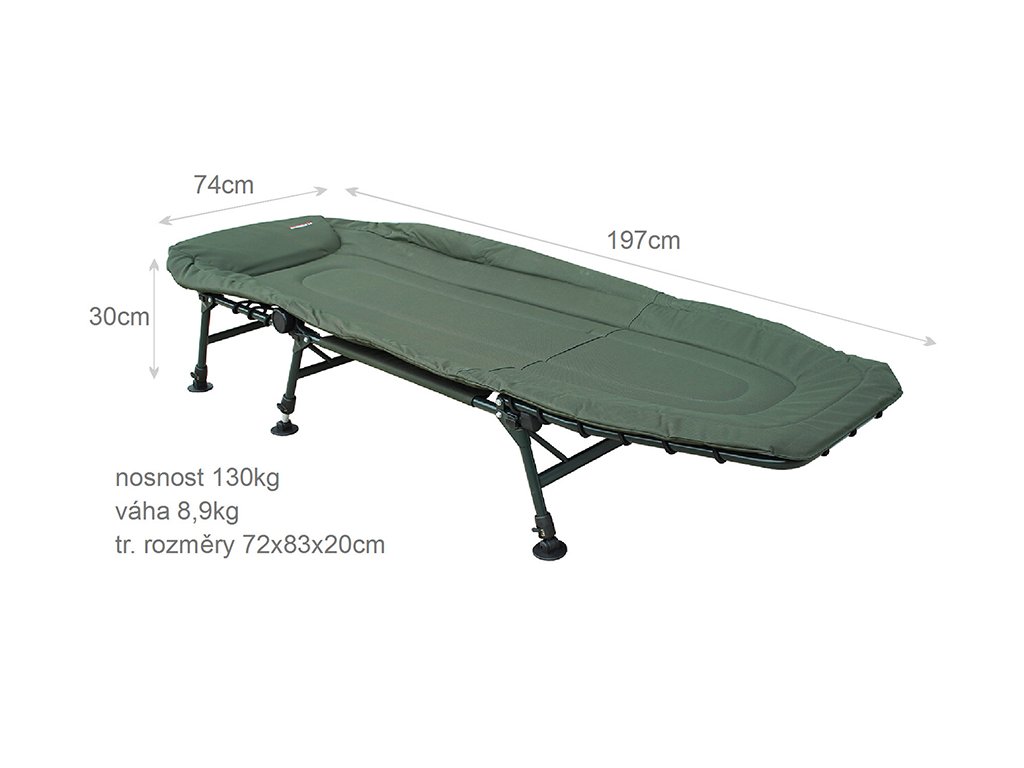 <p>Lehátko Fishmaster s třemi páry nohou, ocelovou konstrukcí a matrací z 600D Oxford-Nylonu s termoizolační vrstvou. Celková nosnost je 130 kg. Lehátko má klouby sklonu zad, packy nohou s protiskluzovým dezénem, aretaci nohou proti jejich sklopení a jednoduchý stavitelný zámek.<br />6 x noha<br />Ocelová konstrukce<br />Kloub nastavení sklonu zad<br />Aretace nohou - nehrozí zhroucení lehátka<br />Nohy s packou s antismykovou dosedací plochou<br />Kvalitní nepromokavá matrace s límcem<br />Dolní část matrace z lehce omyvatelného materiálu<br />Transportní rozměry 72x20x83cm<br />Nosnost 130kg<br />Váha 8,9kg</p> <p></p>Doplňkové parametry