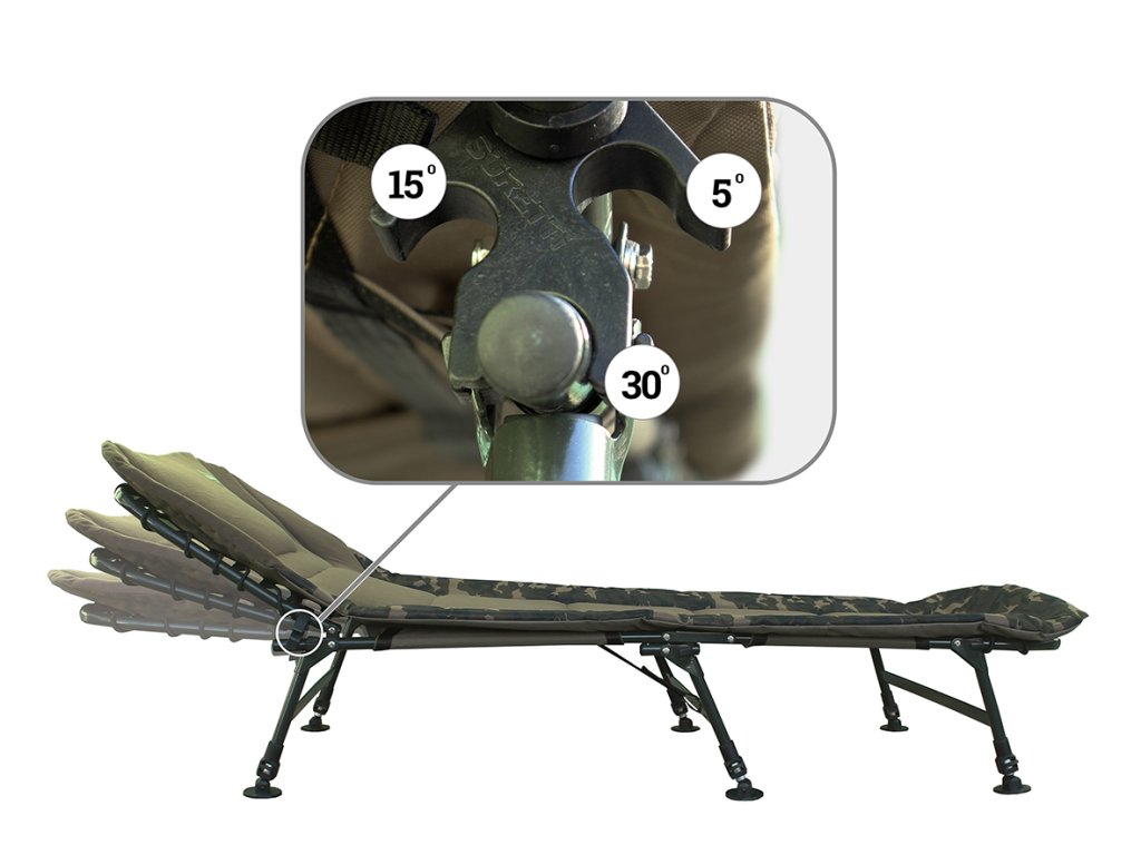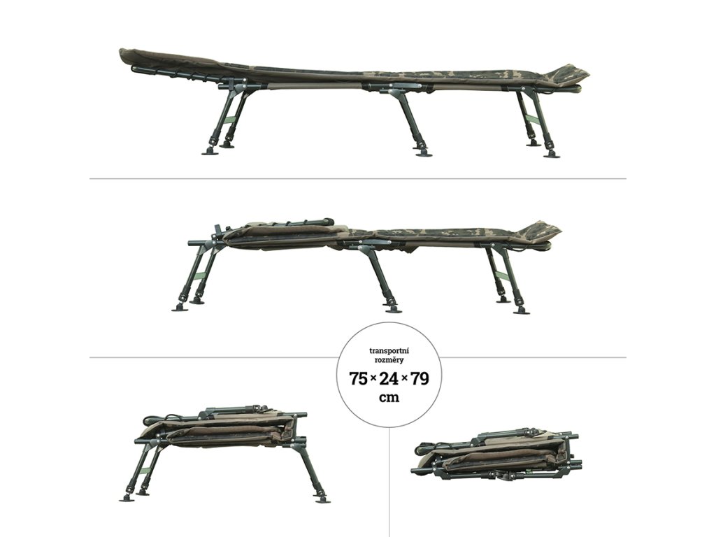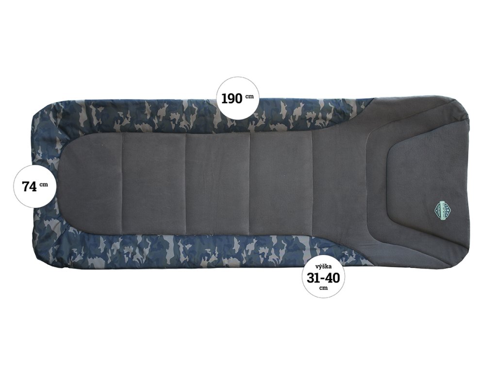 <p>Lehátko Therapy Camo je šestinohé ploché lehátko bez kloubu se stabilitou osminohého lehátka. Unikátní rozložení tří párů noh umožňuje sezení po celé jeho délce. Nohy mají aretaci proti sklopení. Střed matrace je z mikro fleece, po obvodě Camo 600D Oxford a to celé vyplněno termoizolační pěnou. Matrace s polštářem je na konstrukci v prostřední části vyztužena pro větší pohodlí. <br />Therapy Camo má navíc unikátní patentovaný polohovací adaptér na nastavení podhlavníku ve třech úrovních.</p> <p>6x noha, ocelová konstrukce<br />Aretace nohou v rozložené poloze<br />Unikátní patentovaný polohovací adaptér pro nastavení sklonu podhlavníku pod úhly °0, °15, °30 <br />Nohy s antismykovou packou<br />Rozměr matrace 190x74 cm<br />Transportní rozměry 76x24x79 cm<br />Nosnost 150kg<br />Váha 8,8 kg</p>Doplňkové parametry