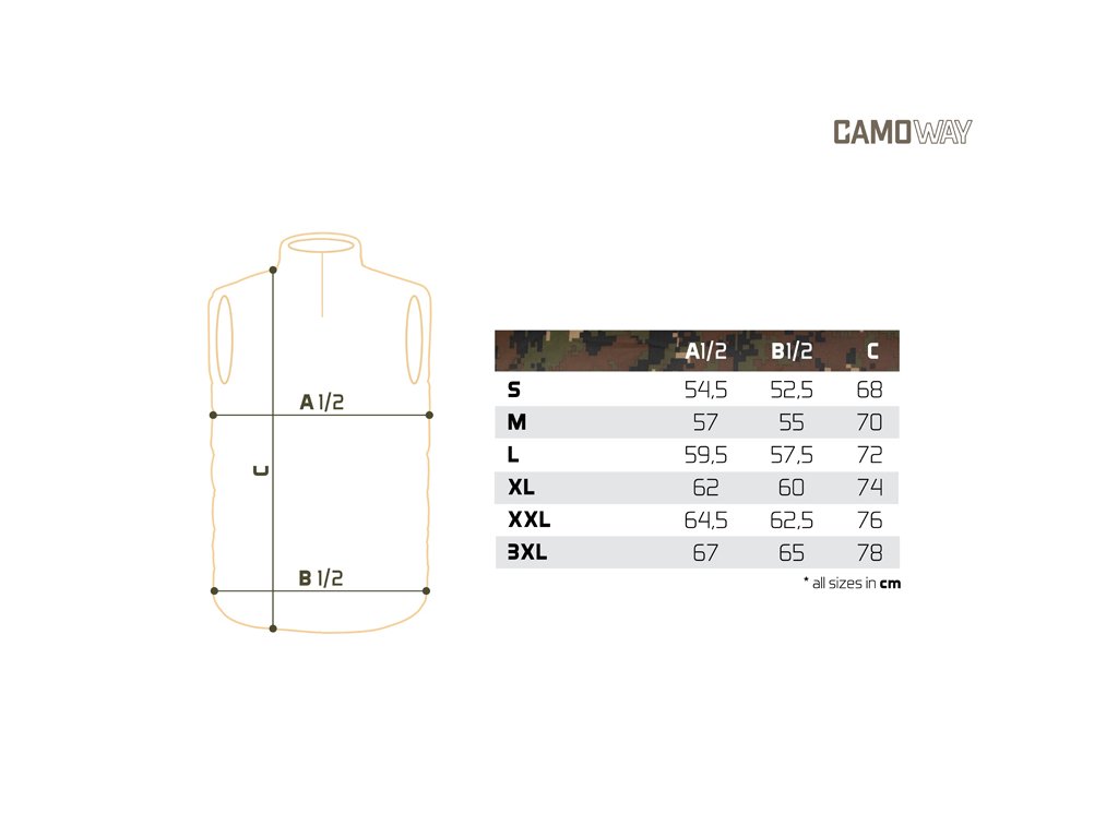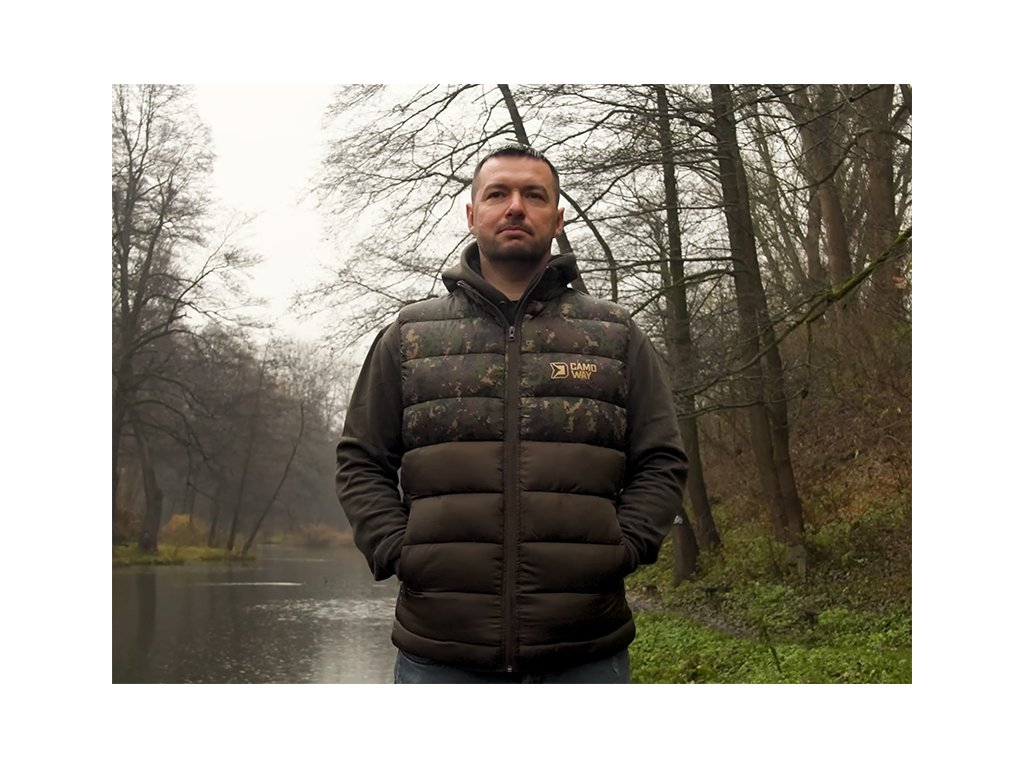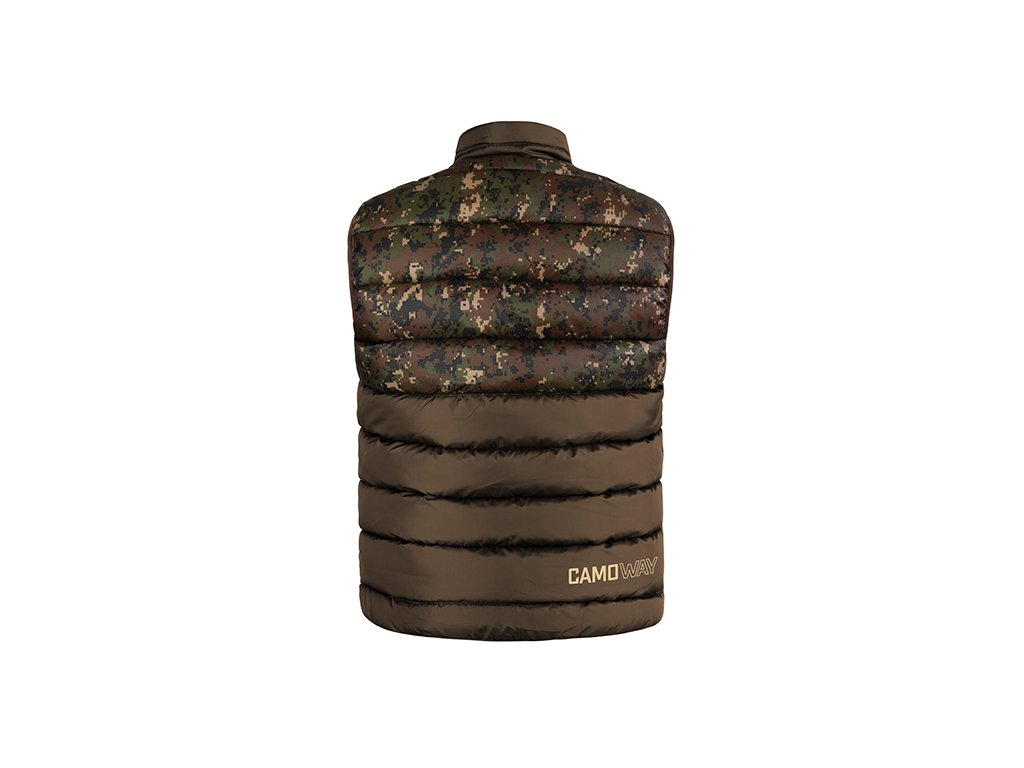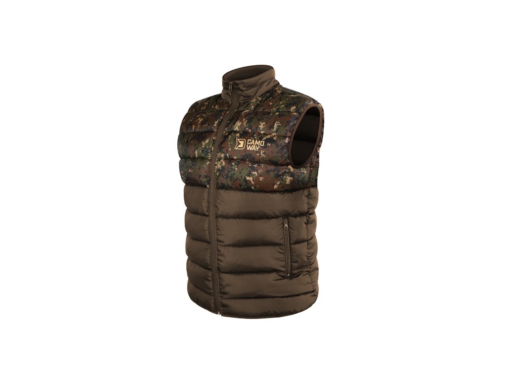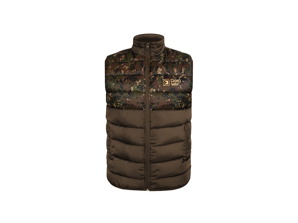 Zateplená vesta přinášející skvělý tepelný komfort během chladných, podzimních či zimních dní. Je vyrobena z tkaniny, která je příjemná na dotek a zároveň snadno udržovatelná, což je velmi praktické při použití během rybolovu a jiných outdoorových aktivitách. Vesta je zároveň příčně prošívaná, což vytváří stylový vizuální prvek produktu. Výplň vesty je extra lehká a zajišťuje výborné termoizolační vlastnosti. Zapínání je zajištěno pomocí kvalitního zipu, překrytého z vnější strany tkaninou, což zvyšuje jeho odolnost vůči vnějším podmínkám. Na obou stranách se nacházejí dostatečně velké kapsy na ruce nebo pro odložení potřebného příslušenství. Vesta CamoWAY disponuje také vyvýšeným límcem pro lepší překrytí krku a šíje při nízkých teplotách vzduchu. Design se skládá z tmavě hnědé barvy zkombinované s digitálním camo vzorem doplněným stylovým logem CamoWAY ve světlé barvě. Materiálové složení: 100% PolyesterDoplňkové parametry