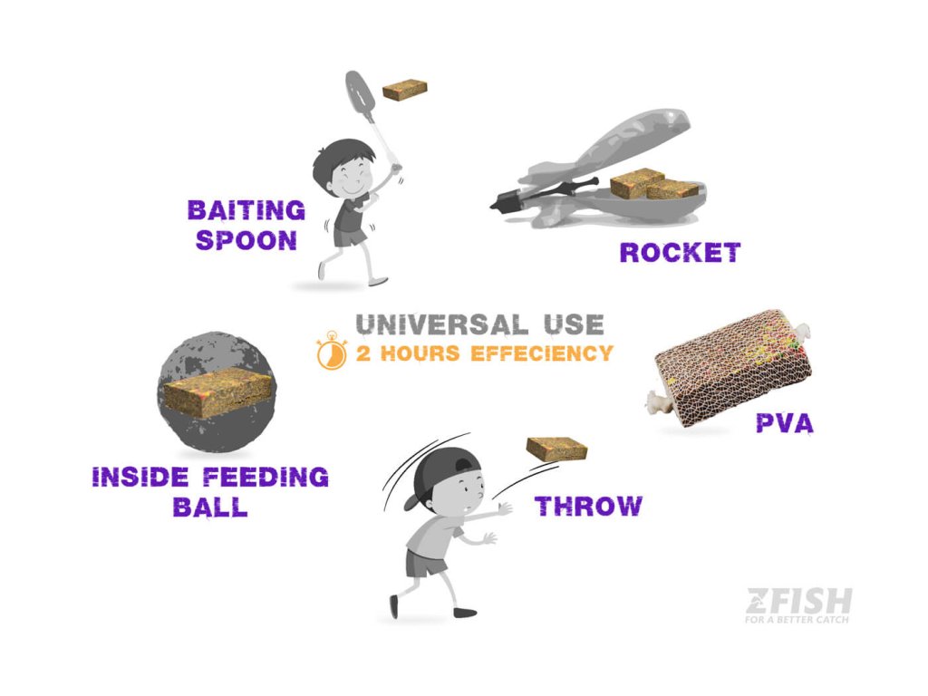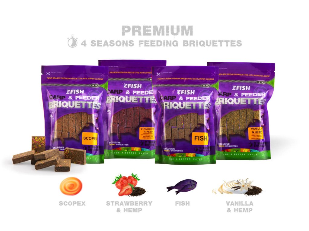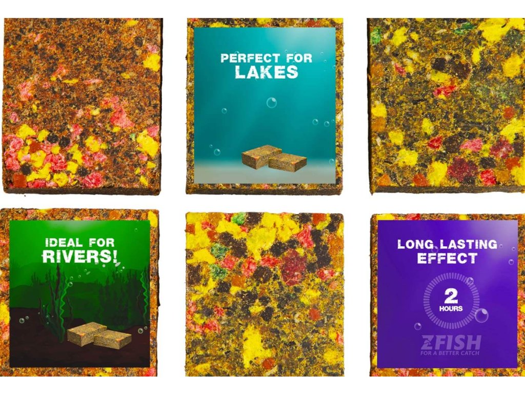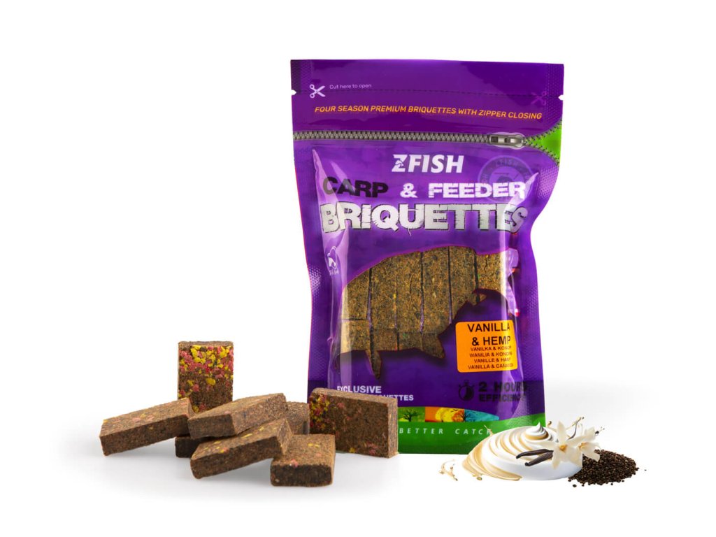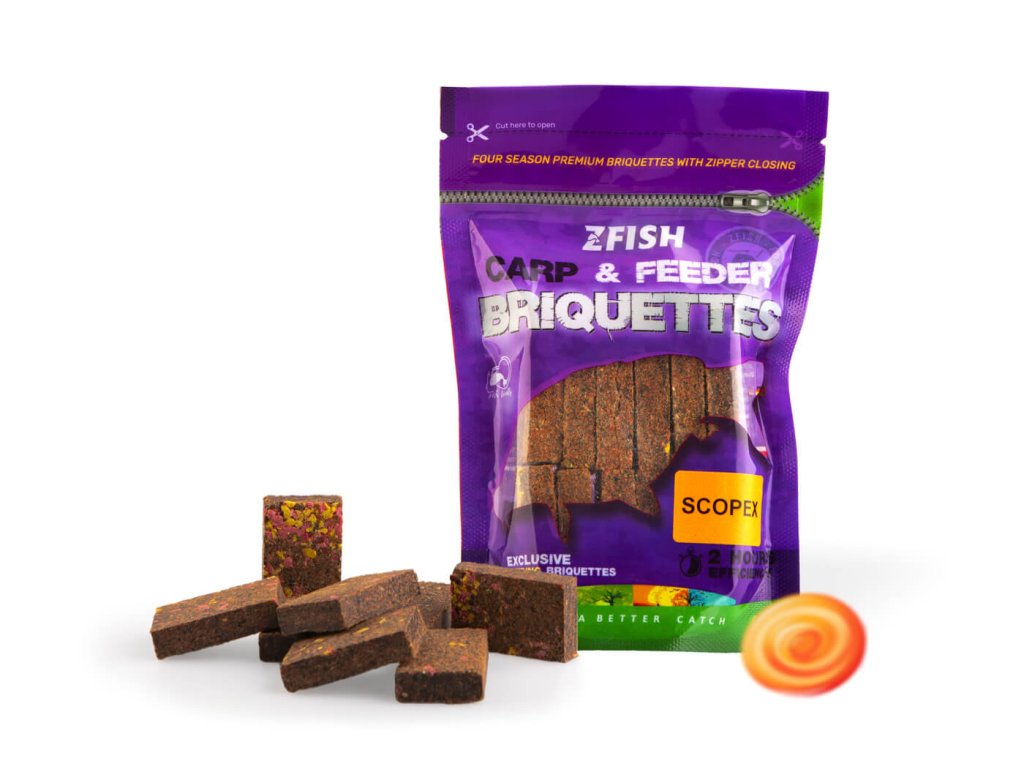 ZFISH Briquettes jsou žhavá novinka v našem krmném programu. Jedná se o velmi kvalitní a tlakově slisovaný, drobný partikl s krmítkovou směsí a anglickou vločkou, do tvaru malých kvádrů ( briket ). Obrovskou výhodou těchto “briket” je jejich skutečně pozvolné a pomalé rozpouštění a vytváření hustého a dlouhotrvajícího “oblaku” rozpuštěného krmiva. Samotné použití těchto briketek je velice snadné a univerzální a lze je používat celoročně, jak ve studené tak i teplé vodě. Dá se s nimi velice jednoduše zakrmit či dokrmit a zatraktivnit tak vaše lovné místo mnoha způsoby. Nejjednodušší je briketky samozřejmě ručně naházet, nebo nastřílet prakem, ale dají se bez problému použít do PVA punčošek, nebo například trochu “rozlámat” a přidat jako další složku do Vaší krmné směsi. Jak celé, tak částečně nalámané vydrží na krmném místě opravdu dlouho a díky svému hranatému tvaru a rozměrům ( 45x30x12mm ) je většina ryb nedokáže nasát, takže Vám je z rozkrmeného místa jen tak snadno “nevyluxují”. Tyto vlastnosti rovněž oceníte v proudech, kde briketkám výrazně napomáhají zůstat na požadovaném místě mnohem déle než běžné krmení, protože je proud prostě tak snadno neodnese. Věříme, že kdo je jednou vyzkouší, tak si jejich jedinečné vlastnosti zamiluje a stanou se nedilnou a univerzální součástí jeho krmné strategie.