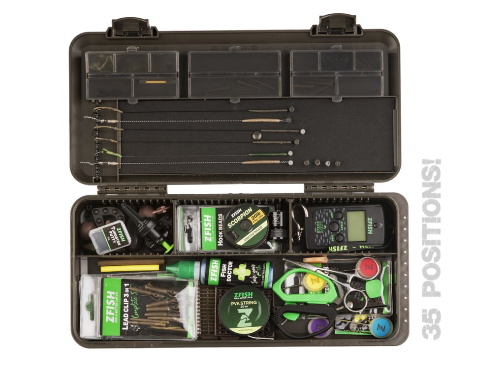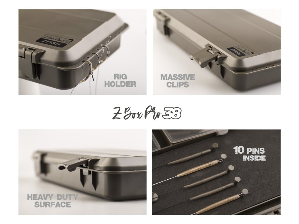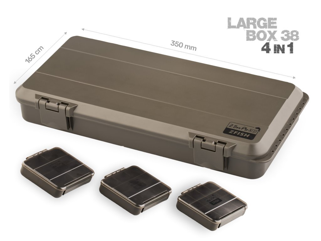 ZFISH Z-Box PRO 38 je praktický a univerzální tackle box od české značky ZFISH. Tento šikovný organizér je kompaktnější verzí modelu PRO 45 a disponuje 38-mi přihrádkami z nichž většina je nastavitelná díky vyjímatelným přepážkám. Bezpečné uzavření a nechtěné otevření zajišťují dva bytelné aretační klipy. Víko organizéru je opatřeno robustními, uzavíratelnými přihrádkami a dále nabízí kompletní zásobník na návazce s hrazdou pro háčky, pěnovou částí o velikosti 270 x80 mm a 10-ti kusy špendlíků a integrovaným pravítkem. Další vychytávkou u tohoto konkrétního modelu tackle boxu je integrovaná děrovaná lišta pro zavěšení hotových montáží umístěná na jedné z kratších stran spodní části boxu. Celkové rozměry boxu jsou 350 x165 cm s hloubkou 50 mm, takže spolehlivě pojme drobnou bižuterii včetně pomůcek pro samotné vázání návazců a montáží, jako jsou nůžky, kleště, jehly, utahovače uzlů apod. Nadstandartní výbavou tohoto pořadače jsou další 3 menší samostatné krabičky o velikosti 102 x 80 x 24 mm s 4, 6 a 8-mi přihrádkami. Jednoduchý a čistý design se zkosenými a oblými hranami nejen skvěle vypadá, ale díky oblým tvarům je i samotná manipulace mnohem příjemnější. Celkově výborný dojem už jen podtrhují odolné materiály, jednotlivé komponenty ve velmi elegantním, temně olivově zeleném provedení. Tento organizér využijete při většině rybolovných technik, především však při kaprařině a feederu.