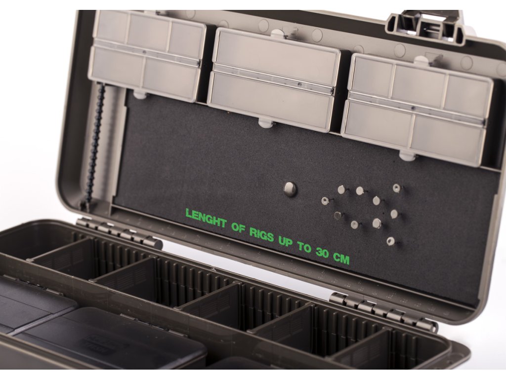 • Víko opatřeno uzavíratelnými přihrádkami a kompletním zásobníkem na návazce včetně aretačních špendlíků a pravítka