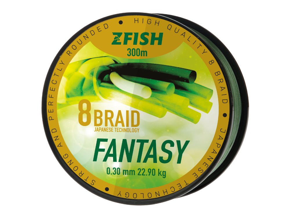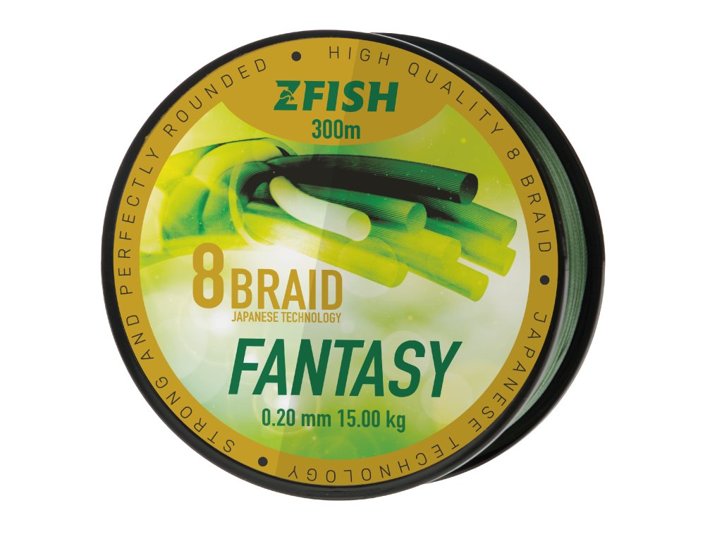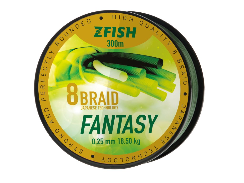 Zfish Fantasy 8-Braid to je kvalitní, pevná a dokonale kulatá pletená šňůra vyrobená japonskou technologií za použití 8-mi vysoce kvalitních PE vláken. Díky použití 8-mi vláken je dosaženo kulatého průřezu a šňůra tedy v očkách prutu neklade takový odpor, snáze klouže a tím pádem jsou s ní náhozy přesnější a delší. Nejnovější technologie splétání zaručují vysokou pevnost v uzlech a zvýšenou odolnost proti oděru. Šňůra FANTASY nenasákává vodu, takže nemění odhozové ani potápivé vlastnosti, dobře řeže vodu a její barva se vymývá a ztrácí velice pomalu.
