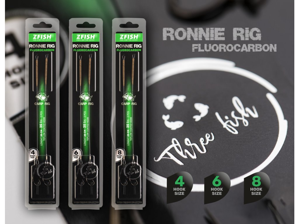 Velice efektivní ručně vázaný návazec RONNIE RIG poskládaný z komponentů prvotřídní kvality. Jedná se o montáž určenou především pro lov s plovoucí nástrahou těsně u dna. S Ronnie Rigem bude váš lov vždy o level úspěšnější. Podstatou montáže je velmi ostrý háček, který pomocí závrtávacího trnu (nástraha je volně pohyblivá) několikanásobně zvýší pravděpodobnost zapíchnutí háčku v rybí tlamě. Dalším důležitým prvkem montáže je zarážka, která drží trn s nástrahou na požadovaném místě. Montáž je vyrobena z fluorocarbonu, což zajišťuje nízkou viditelnost pod vodou a vyšší šance na úspěšný záběr. Antitangle převlek minimalizuje riziko zamotání, což výrazně zvyšuje efektivitu a spolehlivost během rybaření. Tato zcela nová řada s označením "3Fish", to je bižuterie v prémiové kvalitě s využítím nejlepších dostupných materálů. Kdo jednou zkusí a pozná ten rozdíl, jiné už chtít nebude.