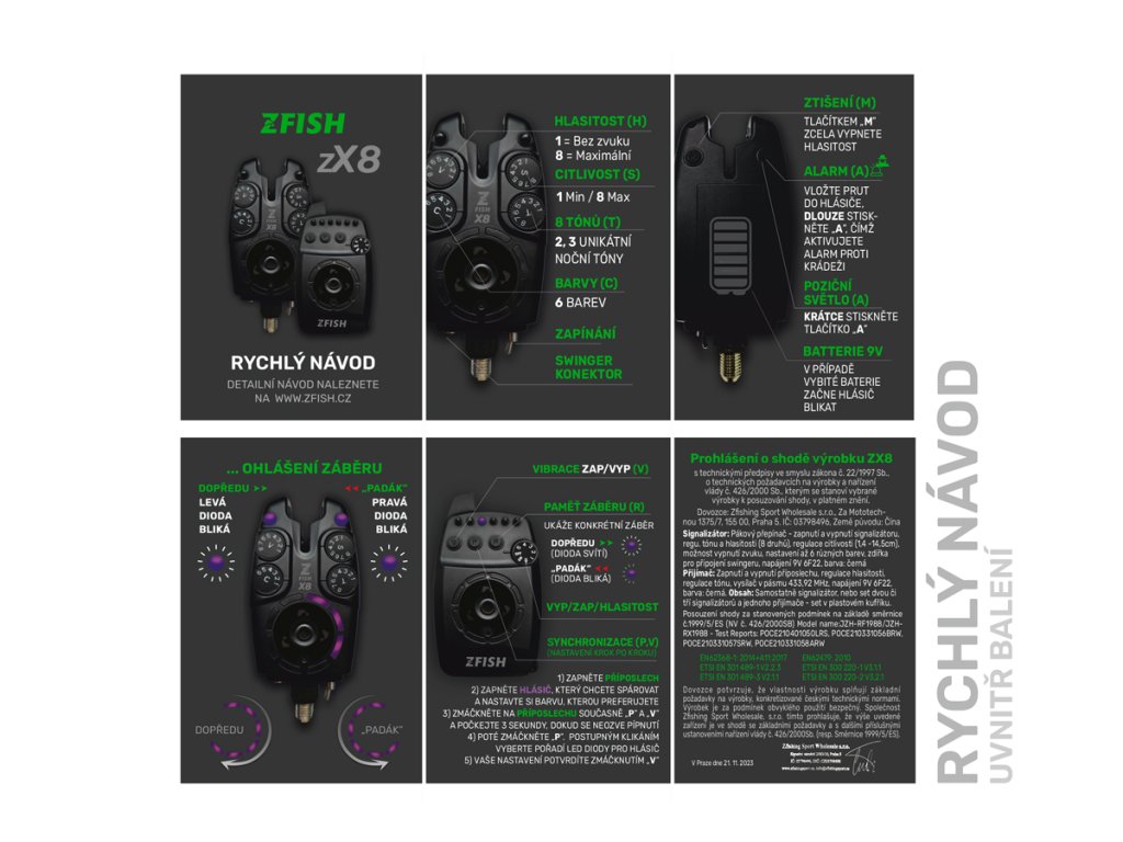 ZFISH Bite Alarm Zx8 je nepochybně naše nová vlajková loď mezi hlásiči. Při vývoji a navrhování těchto hlásičů jsme kladli důraz na odstranění všech běžných nešvarů a můžete si být jistí, že tyto hlásiče jsou skutečně “vymazlené” do posledního detailu, zkrátka hlásiče nové generace. Zx8 disponují 6-ti barvami a dokonce 8-mi zvukovými tóny ( z nichž 2 jsou zcela unikátní hluboké tóny speciálně navržené pro noční rybolov ) a navíc jsou opatřeny alarmem proti krádeži. Další užitečnou funkcí je paměť záběrů, která vám umožní zjistit zda jste měli “jízdu” (záběr vpřed ), nebo takzvaný “padák” ( zpětný záběr směrem k vám ). Samozřejmostí jsou vibrace příposlechu a snadné nastavení celkové citlivosti a hlasitosti. Zx8 byly testovány v extrémních podmínkách, takže za jejich odolnost proti vodě a prachu, můžeme dát ruku do ohně a navíc bezproblémů fungují až na vzdálenost 200m.